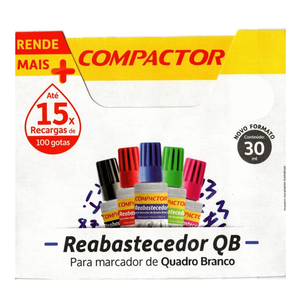REFIL REABASTEDOR PARA PINCEL MARCADOR DE QUADRO BRANCO COMPACTOR Pedidos feitoas ate as 12:00 h (Seg a Sex) serão enviados no mesmo dias!!!!! DESCRIÇÃO: ● Contém: 30ml ● Recarrega até 15 vezes ● Tinta atóxica ● Composição: a base de álcool, corantes orgânicos, resinas e solventes ● Vendido por unidade CORES: Azul REF: 2432001 Preto REF:2431001 Rosa REF:2432014 Verde REF:2432003 Vermelho REF:2432002 Reabastecedor QB 30ml Mantenha seu marcador funcionando por muito mais tempo. Use recargas originais Compactor. A tinta reabastecedora Compactor é a garantia que você tem para usar seu marcador por muito mais tempo sem comprometer a qualidade do produto.