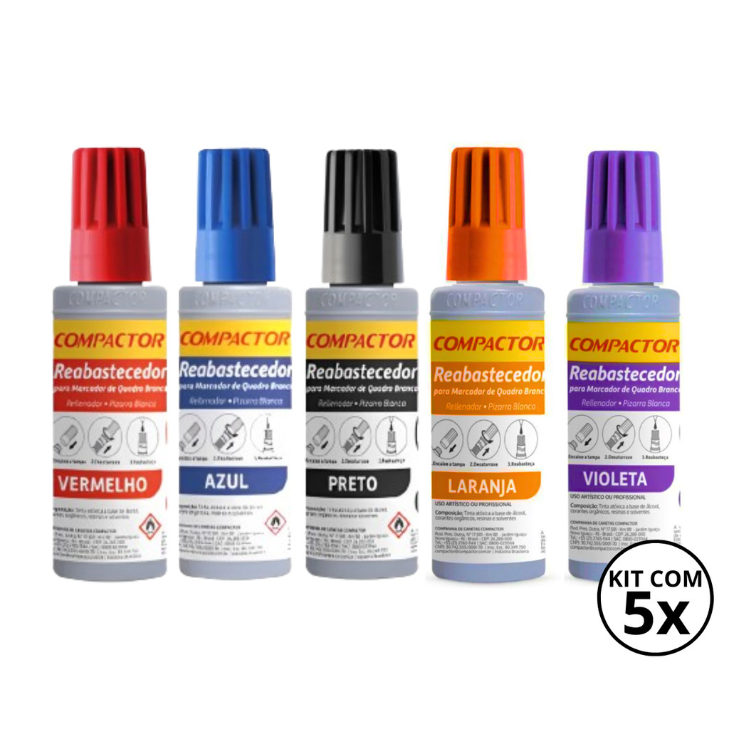 KIT 5 REFIL REABASTEDOR PARA PINCEL MARCADOR DE QUADRO BRANCO COMPACTOR Pedidos feitoas ate as 12:00 h (Seg a Sex) serão enviados no mesmo dias!!!!! DESCRIÇÃO: ● Contém: 30ml ● Recarrega até 15 vezes ● Tinta atóxica ● Composição: a base de álcool, corantes orgânicos, resinas e solventes Reabastecedor QB 30ml Mantenha seu marcador funcionando por muito mais tempo. Use recargas originais Compactor. A tinta reabastecedora Compactor é a garantia que você tem para usar seu marcador por muito mais tempo sem comprometer a qualidade do produto.