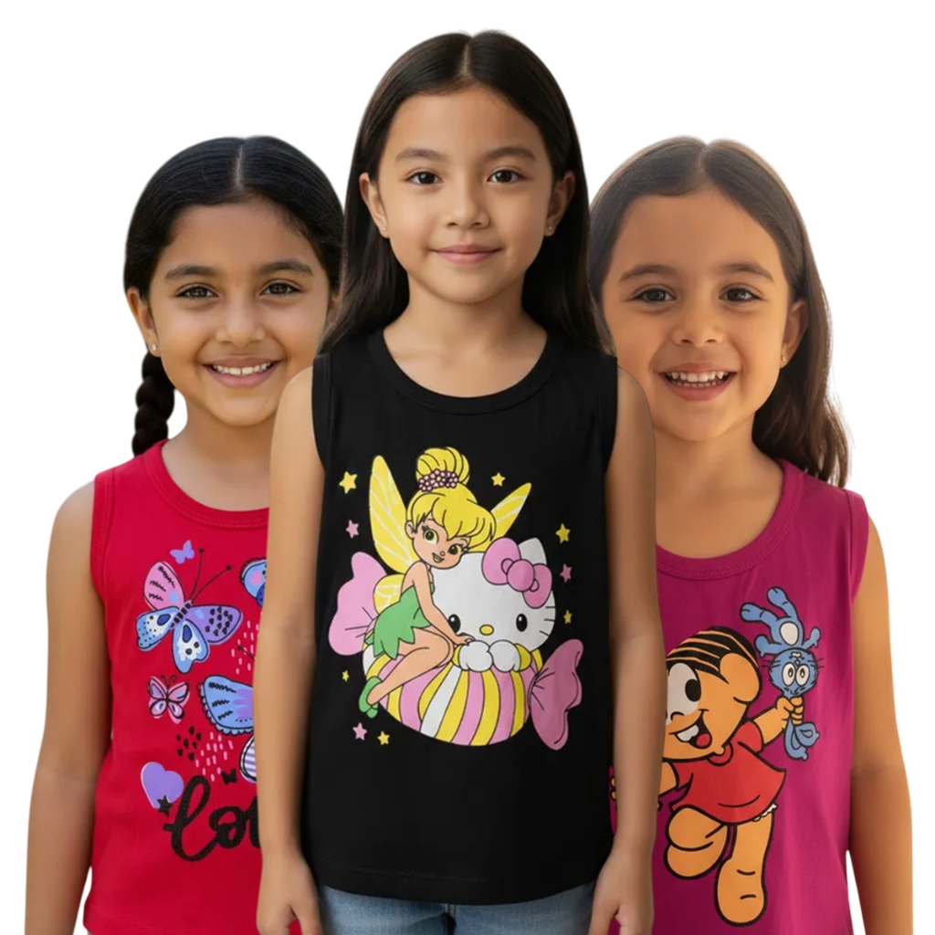 Kit 5 Regatas Infantil Feminina Estampada Desenhos de Menina 100% Algodão 2 à 8 Anos