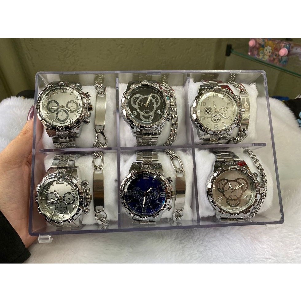 BEM VINDO A AG IMPORTS ENVIAMOS EM ATÉ 24 HORAS! KIT CONTÉM: A FOTO MOSTRA 6 RELÓGIOS POIS SÃO MODELOS DISPONÍVEL,POREM SERÁ ENVIADO: 5 RELÓGIOS MASCULINOS EM AÇO + 5 PULSEIRA EM AÇO OBS: OS MODELOS SÃO ENVIADOS ALEATÓRIOS MAS TODOS SEGUINDO MESMO PADRÃO, DEPENDE DA DISPONIBILIDADE DO ESTOQUE. kit contem relógios masculinos pulseira de aço com caixinhas individuais Acompanha todos com linda pulseira em aço. O kit ja vem montado com relógios sortidos!! Atenção: Devido a alto volume de vendas os modelos são Rotativos sempre haverá mudanças nos modelos!. Os modelos e cores serão enviados aleatoriamente de acordo com estoque. Ideal para presentear, dias namorados, pais, festa, balada, natal, aniversario.