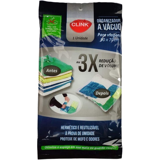 Saco Organizador a Vácuo Para Viagem 50x70cm Roupa Mala Protetor Com Zíper Ganhe espaço para organizar sua mala com destino à viagem dos seus sonhos com a praticidade do saco organizador a vácuo! O Saco Organizador a Vácuo da Clink tem como objetivo facilitar sua vida naqueles momentos no qual você precisa de espaço em sua mala, mas não quer deixar nada para trás. O utensílio promete reduzir consideravelmente o volume de suas roupas dando a você mais espaço e facilidade na organização. Além disso, o produto é hermético, reutilizável, a prova dágua e qualquer umidade e ainda protege contra mofo e odores. Características: - Produto hermético; - Impermeável; - Reutilizável; - Não usa aspirador nem bomba; - Proteção contra mofos, fungos, insetos e odores; - Material: Plástico reforçado. Modo de uso: - Colocar as peças de roupa ou tecido dobrados, secos e limpos ocupando até 10cm abaixo do zíper de fechamento; - Coloque o zíper plástico e deslize para fechar (é necessário que o organizador esteja bem lacrado para garantir seu funcionamento); - Comprima o organizador com as mãos, enrolando o mesmo a partir do zíper assim, o ar sairá pela parte inferior. Cuidados: - Não utilizar objetos cortantes ou pontiagudos; - Não utilizar o organizador para guardar alimentos; - Não recomendado para peças de couro. Dimensões: - Comprimento: 70cm; - Largura: 50cm. Conteúdo do Embalagem: - Kit de 5 unidades Saco a Vacuo.