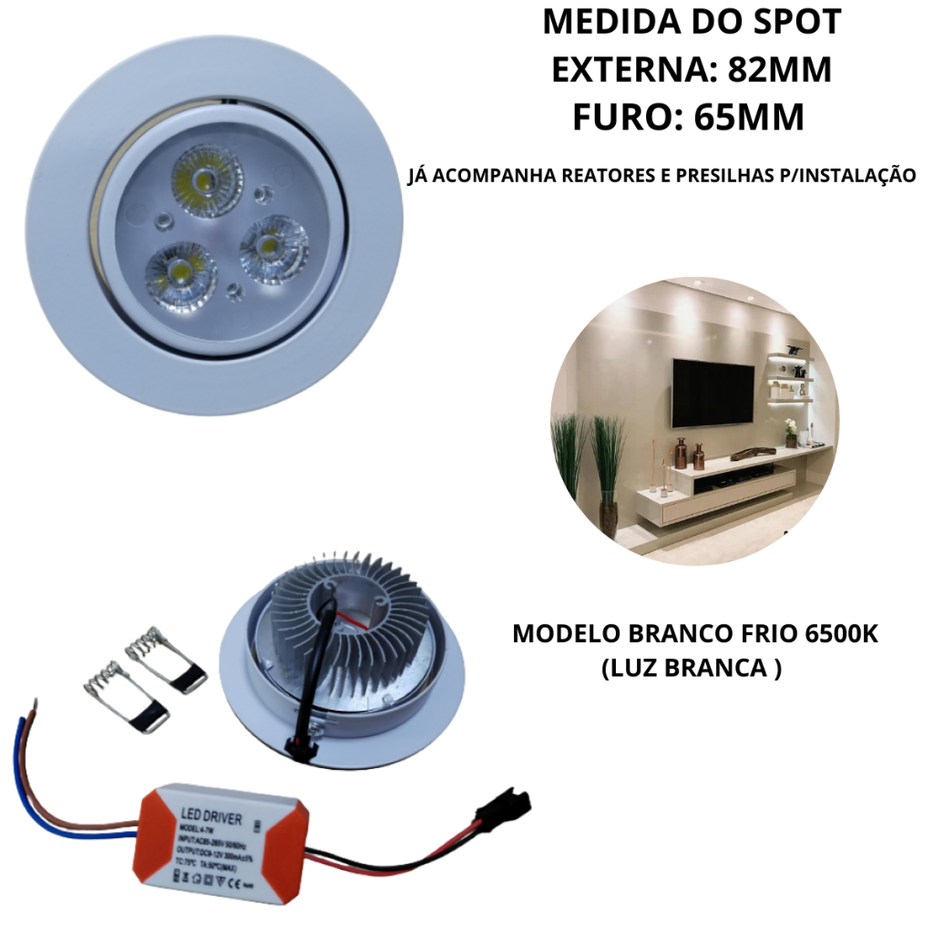Spot LED é ideal para ser utilizada em ambientes internos, embutido em forros de gesso, modulares, forros de madeira, forros de PVC ou similares. Residências, apartamentos, escritórios, condomínios, estabelecimentos comerciais, vitrines, hotéis, entre outros. Com acabamento moderno ele deixa um sofisticado. Kit c/ 5 Spot 3w Super Led Embutir Redondo Direcionável Sanca DESCRIÇÃO DO PRODUTO Cor da Luz: 6500k - Branco Frio ( luz branca ) Especificações técnicas: Quantidade de Leds: 3 x 1W Voltagem: AC100-260V ( Bivolt ) Angulo de abertura: 30 graus Temperatura de trabalho: -20 a 45 Graus Célsius Peso: 120 Gramas Diâmetro: 82 mm Altura: 38 mm Diâmetro do furo: 65 mm