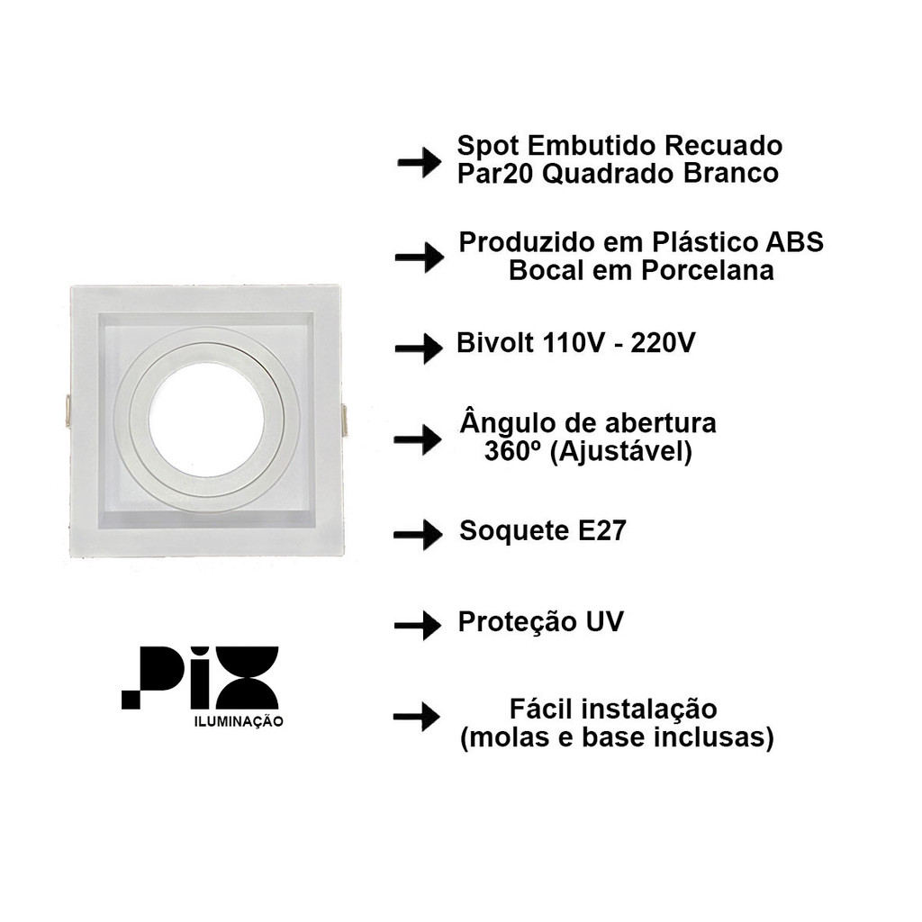 Kit 5 Spot Recuado Par20 Branco + Lâmpada Led 7w Pix