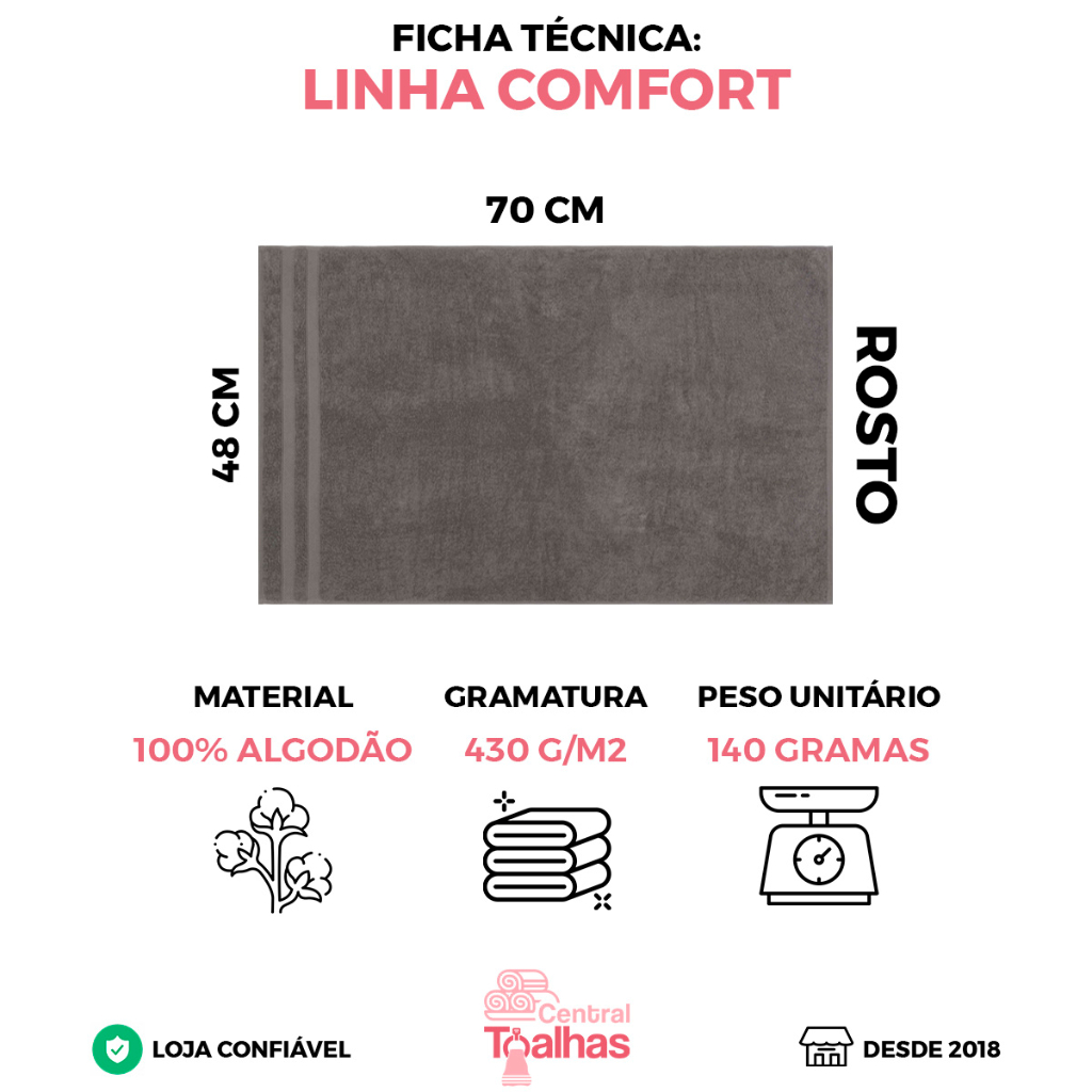 As toalhas de rosto fio penteado da Linha Comfort une conforto, qualidade e sofisticação para transformar seus momentos de cuidado pessoal. Produzidas em 100% algodão de alta qualidade, passam por um processo especial que garante toque extremamente macio, delicado e agradável na pele. Com medidas de 48cm x 70cm e gramatura de 430 g/m², proporcionam excelente absorção, eficiência e bem-estar no dia a dia. Além da funcionalidade, se destacam pelo design elegante, com barra trabalhada e cores suaves que dão um toque de requinte ao banheiro. Duráveis, práticas e versáteis, são perfeitas para uso em família, para quem busca variedade ou para presentear alguém especial. Um kit que combina beleza, conforto e qualidade em cada detalhe. Quantidade de Peças: 5 Toalhas de Rosto Fio Penteado Características do produto Medidas: 48cm x 70cm Peso: 140 Gramas Gramatura: 430 g/m2 Material: 100% Algodão Modelo: Comfort Fio Penteado Garantia: Contra Defeitos de Fabricação