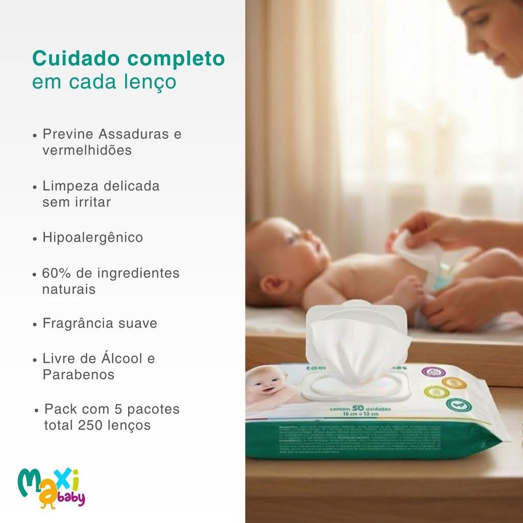 Kit com 5 Toalhas Lenços Umedecidos Hipoalergênico Fragrância Suave Pacote com 50un Cada - Maxi Baby Pack com 5 pacotes de toalhas. Cada pacote contém 50 toalhas, total de 250 toalhas. Proporcione ao seu bebê o cuidado que ele realmente merece com as Toalhas Umedecidas Hipoalergênico Maxi Baby, desenvolvida especialmente para quem busca limpeza suave, segura e eficiente no dia a dia. Ideal para bebês com pele sensível, este lenço umedecido combina tecnologia, proteção e muito carinho em cada uso. Com fórmula hipoalergênica, livre de álcool e parabenos, ele garante uma higiene delicada sem ressecar ou irritar a pele. Produzida com 60% de materiais naturais, garantindo um toque macio e mais seguro para recém-nascidos e crianças de todas as idades. Sua fragrância suave foi cuidadosamente desenvolvida para não agredir a pele, oferecendo frescor sem excesso de perfume. Além disso, ingredientes como aloe vera e extrato de camomila ajudam a acalmar, hidratar e proteger, reduzindo o risco de vermelhidão e irritações, sendo perfeito para as rotinas de troca de fraldas, limpeza das mãos, boca, do rosto e até momentos fora de casa. Para tornar o uso ainda mais prático, a embalagem dispõe de tampa plástica rígida, que preserva a umidade dos lenços por muito mais tempo e evita desperdícios. Cada folha possui tamanho 19 x 13 cm, oferecendo ótima cobertura e facilitando a higienização completa do bebê. A versão com 50 unidades garante excelente durabilidade, sendo ideal para levar na bolsa maternidade, usar em casa, viagens e em qualquer momento de necessidade. Maxi Baby é sinônimo de cuidado, suavidade e proteção. Uma linha criada para oferecer mais tranquilidade aos pais e bem-estar aos pequenos desde os primeiros dias de vida Principais Características: - Idade Recomendada: 0m+ - Desenvolvido para peles sensíveis (Bebês e Crianças) - Acalma, hidrata e protege a pelo - Ideal para trocas de fraldas, limpeza rosto, mãos e boca - Com Extrato de Camomila - Com Extrato de Aloe Vera - Auxilia na Prevenção de Assaduras - Previne vermelhidões e irritações - Desenvolvido com 60% de Ingredientes Naturais - Clinicamente Testado - Hipoalergênico - Fragrância Suave - Livre de Álcool e parabenos - Tampa plástica rígida: Preserva a umidade das toalhas - Contém 50 unidades de toalhas Especificações Técnicas: - Conteúdo da Embalagem: 5 Toalha Lenço Umedecido com 50un Cada Maxi Baby - Garantia: 30 Dias (Contra Defeitos de Fabricação pelo Fabricante) - Peso: 285g - Código do Fabricante: 25000-5 - EAN: 7898975752634 - Marca: Maxi Baby Imagens meramente ilustrativas, as cores e estampas podem variar de acordo com o lote do fabricante.