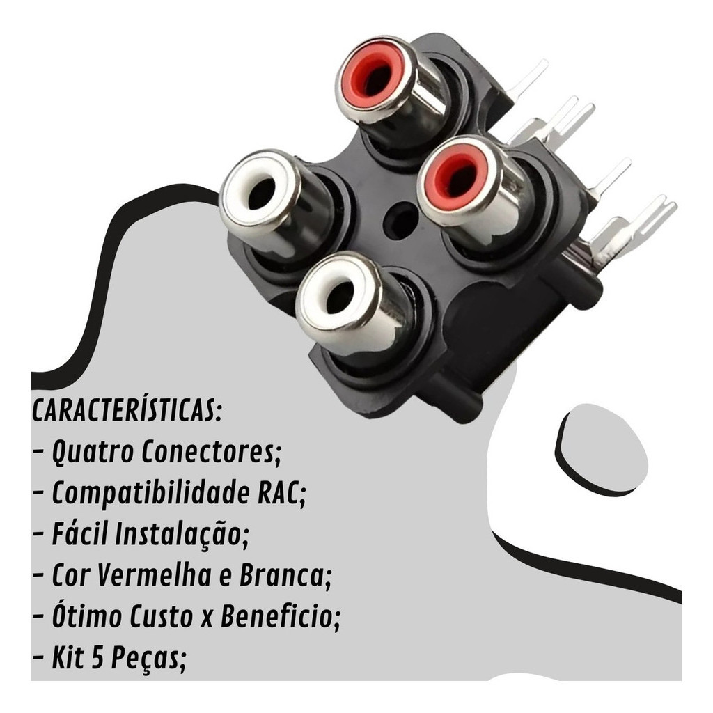 Kit 5 Tomada Conector Rca 2x2 Av4-8,4-7 Painel Vermelho E Branco