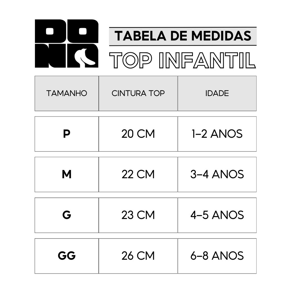 >COMPRA GARANTIDA Somos especialistas em moda infantil, oferecendo produtos de alta qualidade e conforto para as pequenas. Nosso top é perfeito para garantir estilo, liberdade de movimento e diversão nos dias de sol. >DETALHES DO PRODUTO Top fabricado em tecido suede liso, um material macio, leve e com toque aveludado. Acabamento com viés fechado, que proporciona maior durabilidade e conforto. Modelagem estilo nadador, garantindo excelente sustentação e liberdade para brincar. >TAMANHOS DISPONÍVEIS P (1 a 2 anos) M (3 a 4 anos) G (4 a 5 anos) GG (6 a 8 anos) >IMPORTANTE Nossa tabela de medidas é padrão, mas se tiver dúvidas sobre o tamanho ideal, entre em contato conosco! Será um prazer ajudar você a escolher. >TAMANHOS VARIADOS Caso escolha a opção de tamanhos variados, informe as numerações desejadas pelo chat. Se não recebermos a mensagem, enviaremos os tamanhos sortidos. As cores e estampas variam conforme o estoque disponível.. >PERGUNTAS FREQUENTES *As cores desbotam ao lavar? Com o cuidado certo, sua peça continuará linda e colorida. Siga as instruções de lavagem para manter a qualidade e o brilho das cores. *Pode lavar na máquina? Lavar à mão é o mais indicado para preservar o tecido e as cores, mas, caso use a máquina, opte pelo modo delicado. Assim, o top se mantém em perfeito estado. *A peça tem elasticidade? Sim! O tecido contém elastano, proporcionando um ajuste confortável e flexível, perfeito para acompanhar os movimentos das crianças durante as brincadeiras. *Posso escolher as estampas? As estampas são enviadas de forma sortida, garantindo variedade e diversão no kit. Cada compra é uma surpresa cheia de estilo e cores! OBRIGADO POR COMPRAR COM DONA BANANA MODA ÍNTIMA