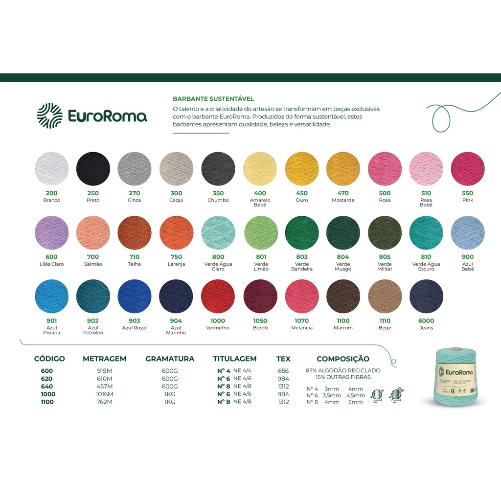 ATENÇÃO: Informe as cores que deseja no chat. Não havendo escolha em até 24h após a compra, serão enviadas cores sortidas mediante disponibilidade de estoque. Contém: 5 unidades. Fabricante: EuroRoma. Composição: 85% Algodão e 15% outras fibras. Espessura: Barbante Colorido FIO 4 Ne 4/4 - Tex 656 / 915 metros / Agulha de Crochê: 3mm / Agulha de Tricô: 4mm. Barbante Colorido FIO 6 Ne 4/6 - Tex 984 / 610 metros / Agulha de Crochê: 3,5mm / Agulha de Tricô: 4,5mm. Barbante Colorido FIO 8 Ne 4/8 - Tex 1312 / 457 metros / Agulha de Crochê: 4mm / Agulha de Tricô: 5mm. A Eurofios produz fios e barbantes a partir de retalhos de tecidos que não seriam aproveitados, contribuindo assim para o meio ambiente. O pensamento sustentável somado à alta tecnologia de seu maquinário dá aos fios ecológicos da Eurofios exclusividade, macies e de extrema qualidade além é claro de respeitar a natureza. ⚠️ AS IMAGENS SÃO MERAMENTE ILUSTRATIVAS DE ACORDO COM AS FOTOS DISPONIBILIZADAS PELOS FORNECEDORES E PODEM VARIAR DE ACORDO COM O LOTE DE FABRICAÇÃO ⚠️