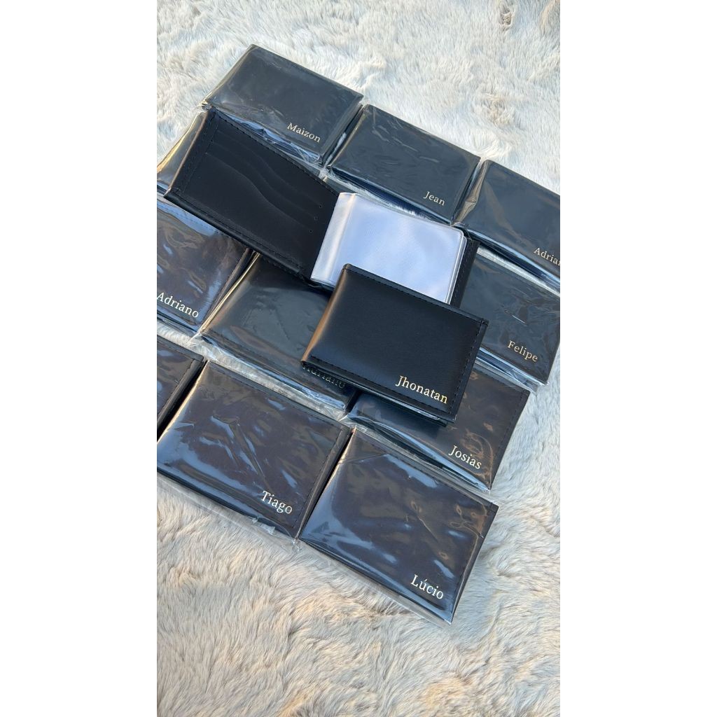 Carteira masculina slim couro sintetico forrada de boa qualidade . Carteira feita com design moderno , para quem não abre mão de um produto elegante . Kit contendo 5 unidades em cada já personalizada. Descrição : *1 compartimento para cédula *6 compartimento para cartão *4 compartimento de plastico que cabe cnh Medidas: Altura : 8 cm Largura : 11 cm A personalização é feita com foil na cor dourada . OBS : AO FINALIZAR A COMPRA MANDAR O NOME DESEJADO . POR SER UM PRODUTO PERSONALIZADO TEMOS 7 DIAS UTEIS PARA FAZER O ENVIO .
