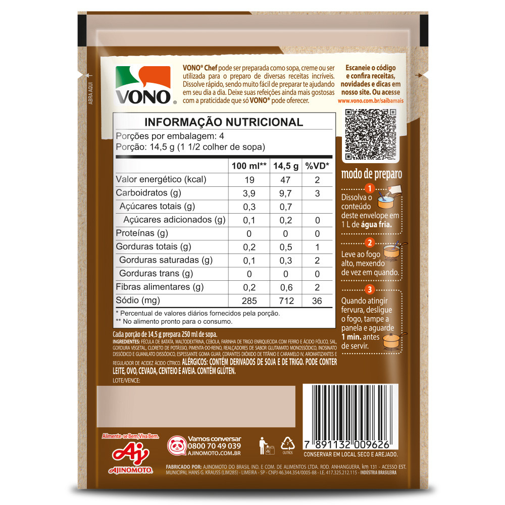 O VONO® Chef é a escolha perfeita para quem busca praticidade, sabor e versatilidade no dia a dia. Pode ser preparado como uma sopa cremosa ou creme instantâneo, ideal para uma refeição rápida e reconfortante, ou utilizado como ingrediente especial em diversas receitas, agregando textura e muito sabor aos seus pratos. Rápido e fácil de preparar, o VONO® Chef é perfeito para quem deseja uma refeição prática e apetitosa, seja no almoço, jantar ou naquele momento em que bate a vontade de algo quentinho e saboroso. Ele combina com a rotina corrida e também com ocasiões especiais em família. Sabor intenso e experiência deliciosa a cada colherada Uma verdadeira surpresa em sabor! A cada colherada, o VONO® Chef entrega cremosidade e um toque especial, proporcionando uma experiência deliciosa para o paladar. Além disso, pode fazer parte de uma alimentação equilibrada, trazendo mais praticidade sem abrir mão do prazer de comer bem. Seja consumido sozinho ou como base para preparar receitas criativas, o VONO® Chef transforma refeições simples em momentos reconfortantes. Cremoso, versátil e cheio de sabor, é aquela opção que aquece nos dias frios e também combina perfeitamente com qualquer estação. VONO® Chef: deliciosidade e praticidade para todos os momentos.