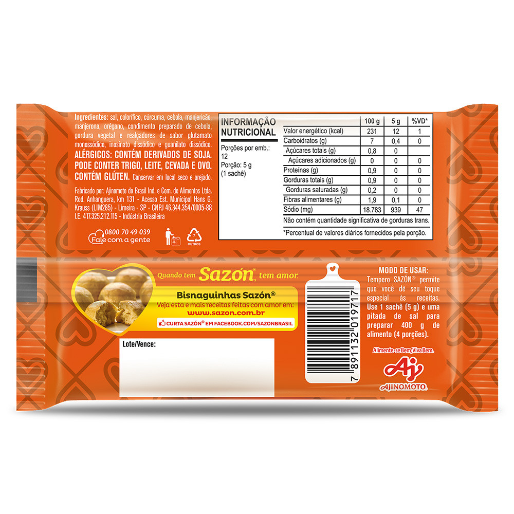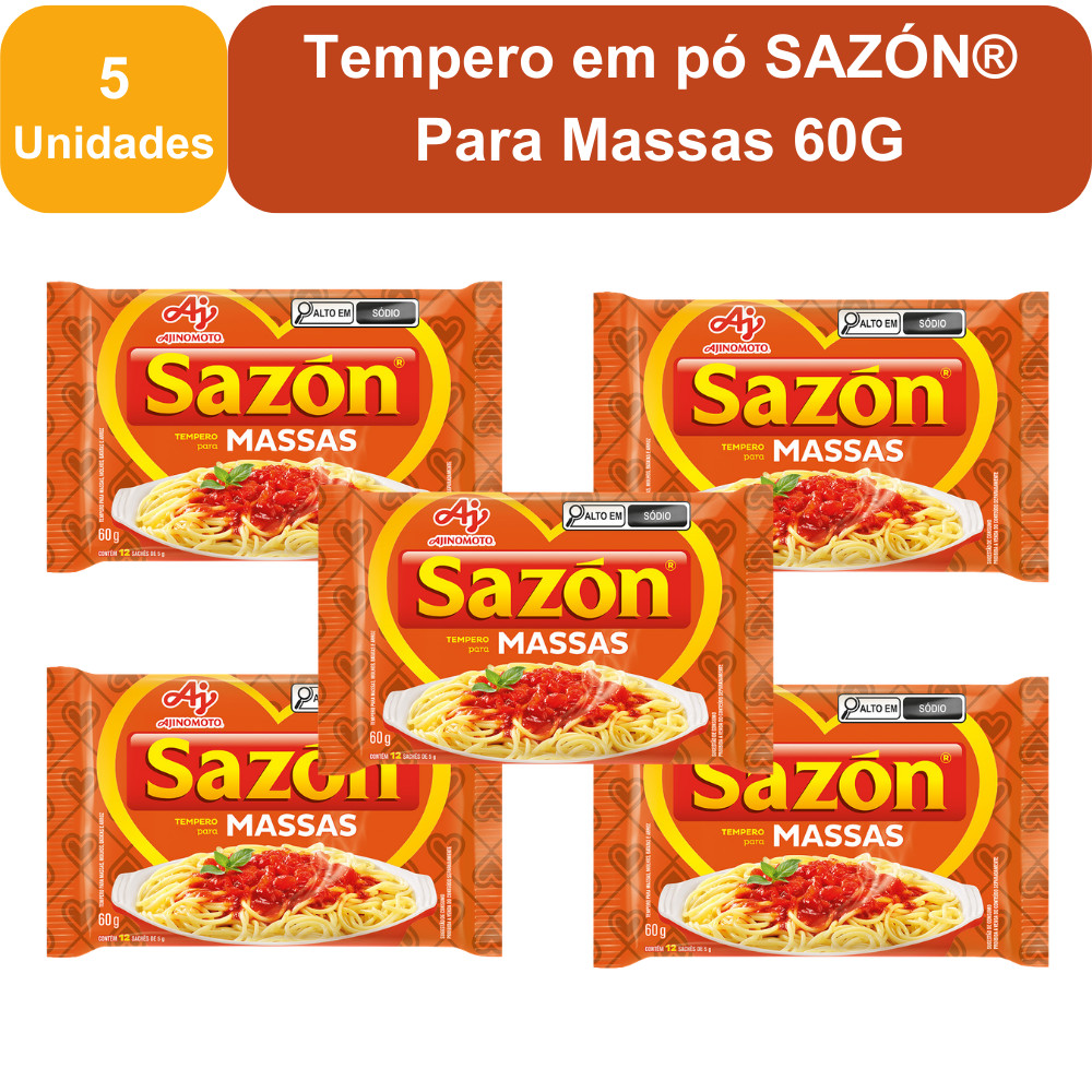 | Kit 5 Unidades Tempero em pó SAZÓN® Para Massas 60G este produto | R$ 39,60 | — | 5.0/5 | 1 |