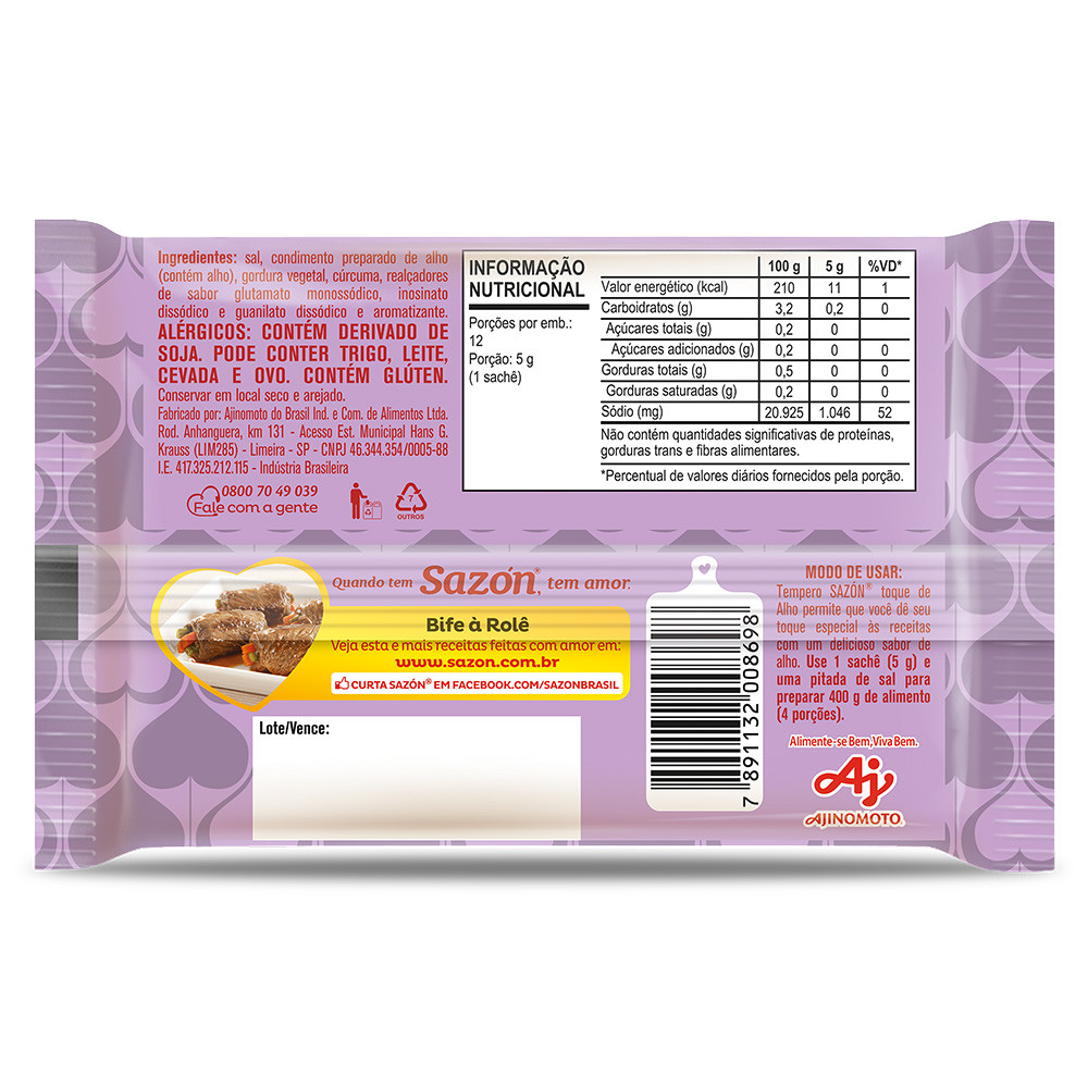 Kit 5 Unidades Tempero em pó Sazón® Toque Alho 60G
