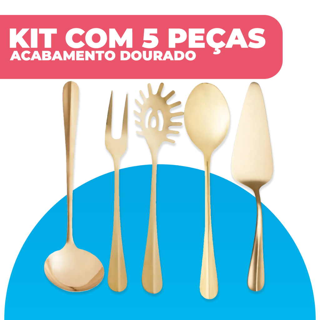 Kit 5 Utensílios de Cozinha Inox Positano Concha Espatula Pegador Colher de Arroz Garfo Dourado Lyor
