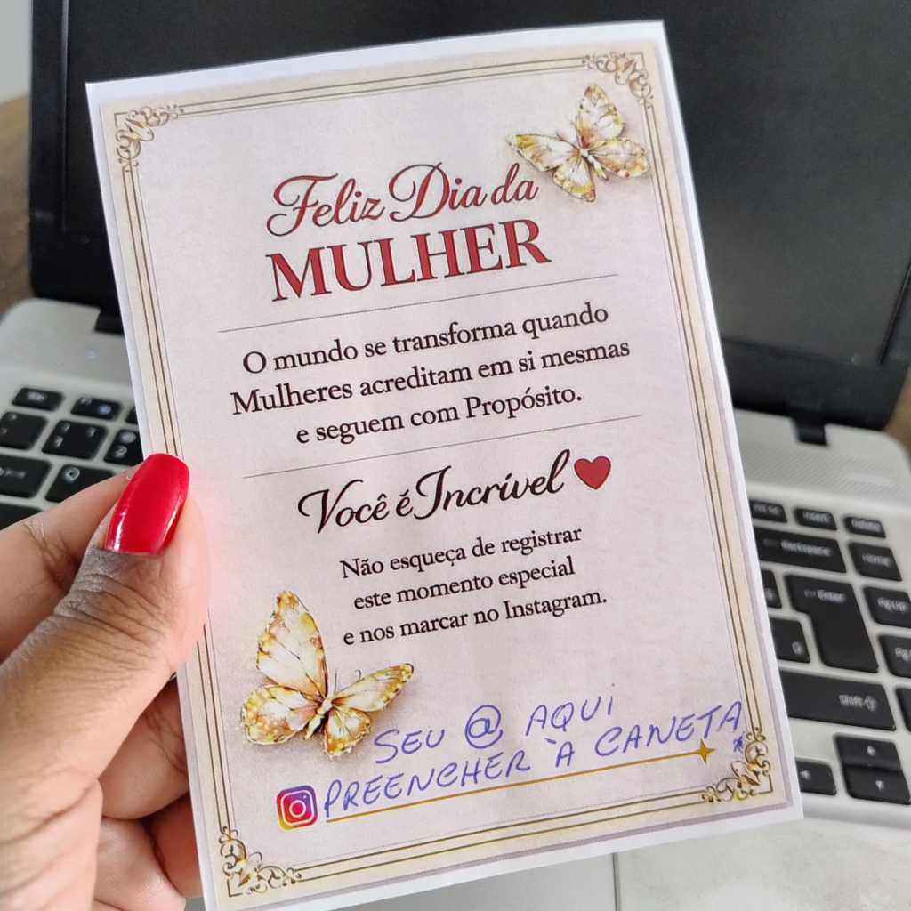 Folhetos de Agradecimento Dia da Mulher com espaço para inserir a sua rede social ( que deve ser preenchida manualmente a caneta ). Detalhes do produto : Tamanho dos folhetos : 10,5 x 14,8 cm Papel : Couche fosco 90 g (obs : papel fininho , mas com uma ótima qualidade na impressão ) Não personalizamos, não fazemos alterações na arte . Quantidades : kits com 50 ou 100 unidades...ou mais ,Você escolhe as quantidades inserindo o produto no carrinho de compras. Encante, agradeça e valorize com um pequeno gesto. O Folheto de Agradecimento Feliz Dia da Mulher é o detalhe ideal para transformar brindes e lembrancinhas em uma experiencia especial. Perfeito para quem quer surpreender clientes, fortalecer a marca e criar conexão no Dia da mulher, pois valoriza o presente com uma mensagem elegante. Demonstra cuidado e atenção aos detalhes. Qualquer duvida estou a disposição no chat.