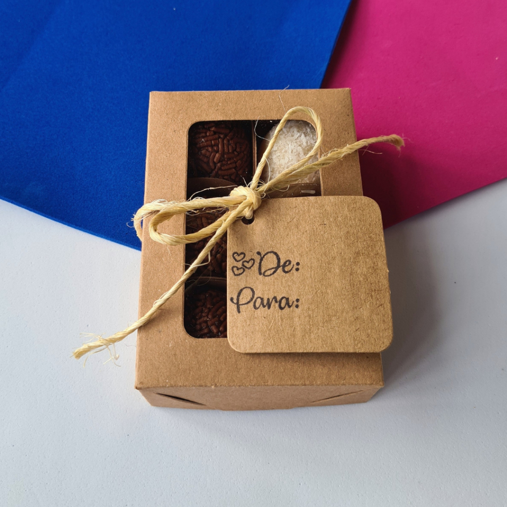 Adquirindo 1 Kit você comprará 50 caixas em papel kraft com visor para presentes e lembrancinhas. Embalagem ideal para 6 doces, 2 brownie, 2 palha italiana, 2 macaron e produtos artesanais. As caixas vão desmontadas para facilitar o transporte. Montagem manual de encaixe, simples e prático Material utilizado: Caixa – papel kraft 240g. Visor – acetato 10 micras. Medidas: 11 cm comprimento x 7,5 cm largura x 3 cm altura. *Não acompanha forminhas de doces* *Não acompanha tags* Vendemos a parte tags e forminhas de doces para comprar junto com as caixas. Todas as fotos são reais dos nossos produtos. Obrigada pela visita. Precisando, estamos a disposição no chat.