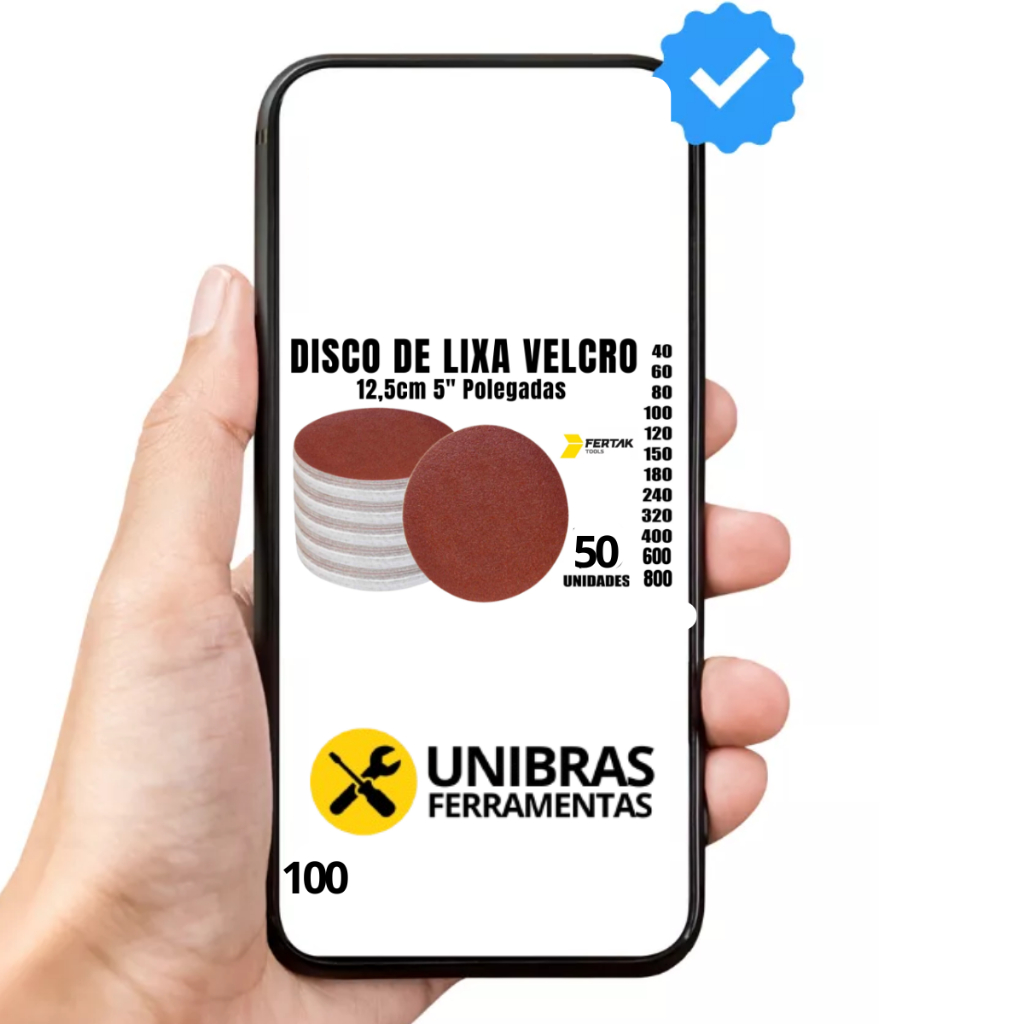 50 UNIDADES DISCO DE LIXA COM VELCRO 125mm - FERTAK - Disco de lixa de alta qualidade e poder de desbaste, amplamente indicado para lixar peças de METAL, MADEIRA, MASSA CORRIDA , PLÁSTICO E SIMILARES. - Perfeito para desbaste de peças com superfície regular e irregular, garantindo um acabamento uniforme devido a sua flexibilidade e poder de remoção. - Lixa disco pluma (Disco de lixa) para suporte de lixa com sistema de fixação Velcro, em tecido abrasivo compactado de oxido de alumínio, diversos grãos, para uso em polimento e rebarbação a seco em inox, metal, alumínio, pedra e plástico, qualidade Flex, super econômica. - Disco indicado para uso com máquina do tipo ORBITAL. - Lixas Sem Furo - Material: Óxido de Aluminio - Grãos: 24, 36, 40, 60, 80, 100, 120, 150, 180, 240, 320, 400, 600, 800, 1200, 1500, 2000, 2400 E 3000 - 125 mm ------- - Material: Óxido de Alumínio - Grãos: 24, 36, 40, 60, 80, 100, 120, 150, 180, 220, 320, 400, 600, 800, 1200, 1500, 2000, 2400 E 3000 - Os Grãos de Números Menores (24, 36, 40, 60, 80) São Mais Grossos. - Os Grãos de Números Intermediários São os de Número (100, 120, 150). - Os Grãos de Números Maiores (180, 220, 320, 400, 600, 800, 1200, 1500, 2000, 2400 E 3000) São mais Finos, e Utilizados Para Acabamento Final das Superfícies. 50 UNIDADES DISCO DE LIXA COM VELCRO 125mm UNIBRAS FERRAMENTAS