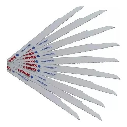 DISTRIBUÍDO POR C-JAÚ FERRAMENTAS Kit 50 Lamina Serra Sabre 12" 14d 20584s110r Lenox Lâmina para serra sabre Lenox - 20584S110R Lâmina sabre bimetálica para madeira, metal e plástico; Dentes reforçados para aumentar a durabilidade; Fabricado em aço de alto desempenho que proporciona flexibilidade para minimizar quebras; Fio de corte em aço rápido e 8% de cobalto; Medida: 12"; Aplicação Em madeira, metal e plástico;