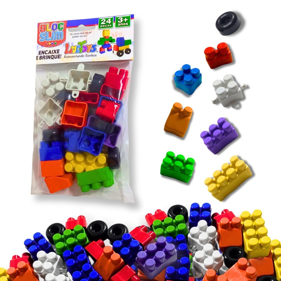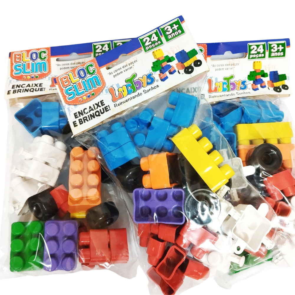 Kit 50 Pacotes Bloco De Montar Encaixar com Rodinha Brinquedo Educativo 24 Peças Oferta Lembracinha
