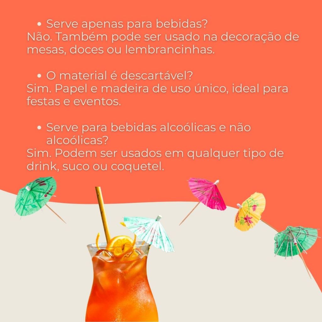Transforme suas festas e eventos com o Kit de Palitos Decorativos Guarda-Chuva da Billa. Com design divertido e colorido, esses palitos são ideais para enfeitar drinks, coquetéis, sobremesas e petiscos, trazendo um toque de descontração e charme para qualquer ocasião. Cada guarda-chuva abre como um mini acessório decorativo, criando um visual alegre que impressiona seus convidados. Com 50 unidades em cada kit, você terá praticidade e economia para preparar suas comemorações sem preocupações. Os palitos são leves, fáceis de manusear e seguros para uso alimentar, permitindo que sejam utilizados em bebidas geladas, frutas, canapés e aperitivos. As cores são sortidas, garantindo um visual vibrante e divertido em cada festa. Esses palitos são perfeitos para aniversários, casamentos, chás de cozinha, festas temáticas ou qualquer evento especial em que a apresentação faça a diferença. Compactos e descartáveis, são fáceis de armazenar e eliminam a necessidade de limpeza após o uso, tornando a organização mais prática. Além disso, proporcionam um acabamento visual sofisticado e descontraído, ideal tanto para uso doméstico quanto em bares e restaurantes que desejam encantar seus clientes. Com o Kit de Palitos Guarda-Chuva Billa, você leva praticidade, estilo e diversão para suas celebrações, deixando cada bebida e petisco mais atraente e especial. Ficha Técnica Quantidade: 50 unidades Modelo: Palitos decorativos guarda-chuva Marca: Billa Material: Papel e madeira Cores: Sortidas Uso: Drinks, coquetéis, petiscos, sobremesas e decoração Tabela de Medidas Altura total: 10 cm Diâmetro do guarda-chuva aberto: 8 cm FAQ – Perguntas Frequentes O produto é novo? Sim, todos os produtos são novos. Tem pronta entrega? Sim, todos os produtos anunciados estão disponíveis para envio imediato. Posso trocar ou devolver? Sim, aceitamos devolução ou troca conforme as políticas da plataforma. O produto acompanha nota fiscal? Sim, enviamos nota fiscal junto com o pedido.