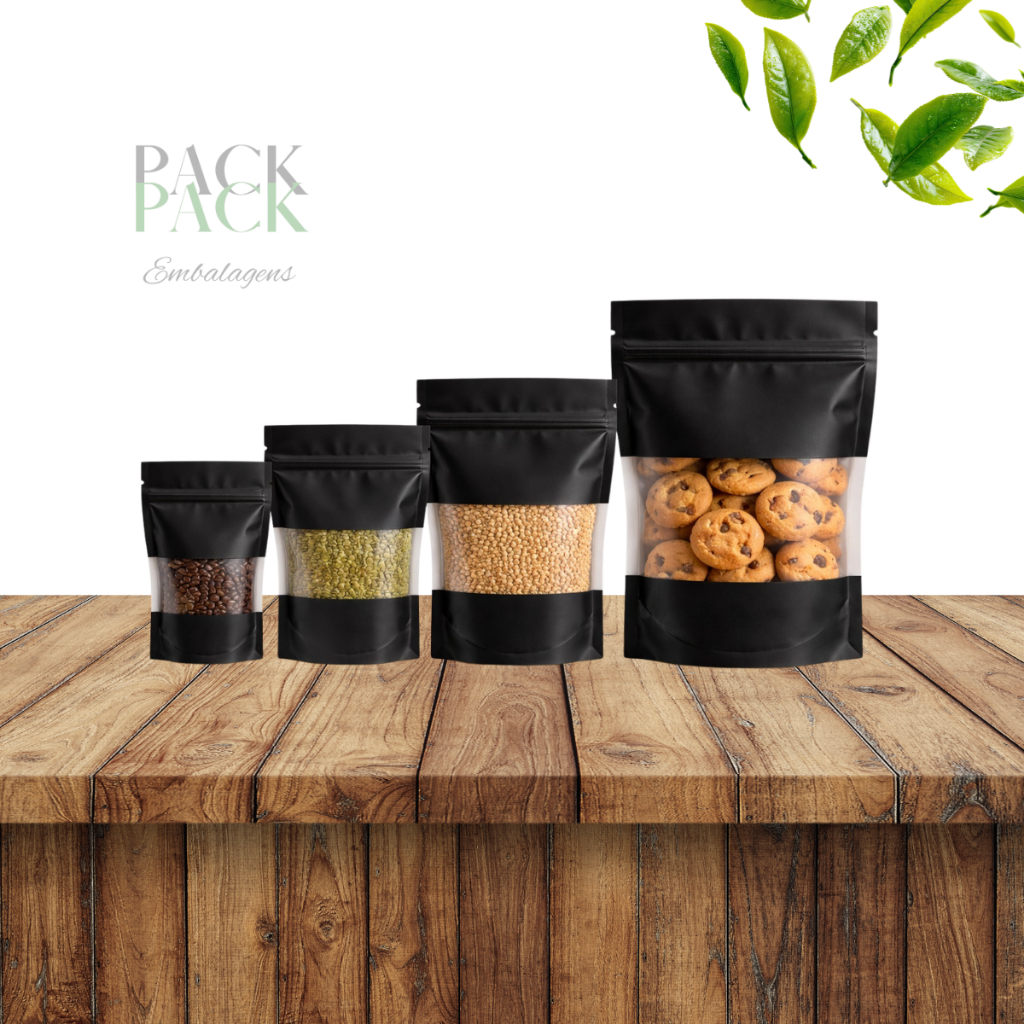 Kit 50 Stand Up Pouch Preto Metalizado Zip e Visor – Saco Hermético Reutilizável Alimentos e Doces