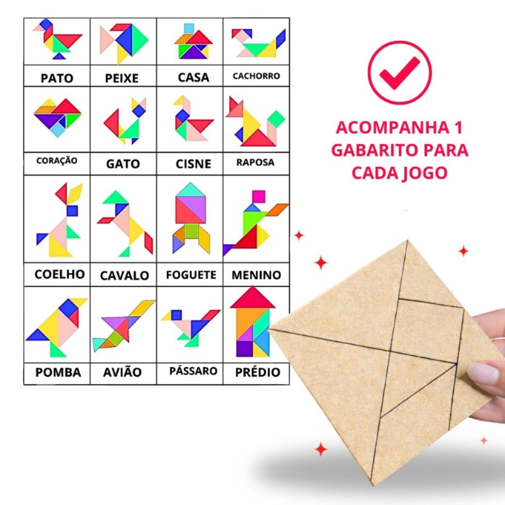 | Kit 50 Tangram Educativo Criança Brinquedo Infantil Pedagógico Lemb... este produto | R$ 35,39 | 51% | 4.7/5 | 9 |