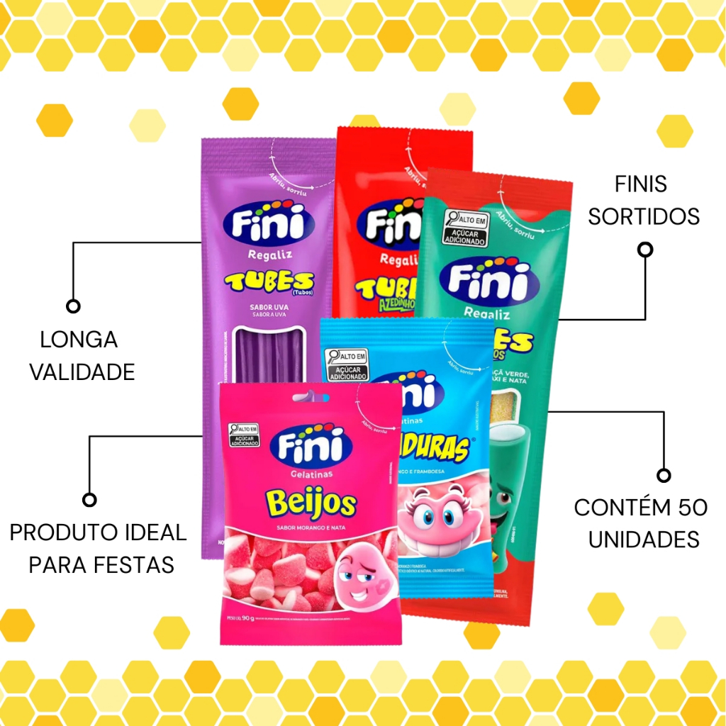 Perfeito para escolas, eventos, Dia das Crianças, Halloween, aniversários e doações. Um combo divertido e saboroso que agrada todas as idades! O QUE VEM NO KIT: 60 BALAS TUBOS FINI SORTIDAS. (Enviadas em display de embalagem, com unidades sortidas de cada sabor.) BALAS ÁCIDAS E COLORIDAS, COM TEXTURA MACIA E SABORES QUE AS CRIANÇAS AMAM! 50 PIRULITOS MASTIGÁVEIS SABOR IOGURTE (DORI). DOCINHO DIFERENTE, MACIO, SABOROSO E COM TEXTURA MASTIGÁVEL QUE FAZ SUCESSO ENTRE OS PEQUENOS. NÃO CONTÉM GLÚTEN ✅ PRODUTOS EMBALADOS INDIVIDUALMENTE. ✅ FÁCIL DE MONTAR KITS E SACOLINHAS. ✅ PERFEITO PARA LEMBRANCINHAS CRIATIVAS. Somos uma loja especializada em artigos de festa, confeitaria, embalagens e doces com lojas físicas no estado de São Paulo, desde 2002.