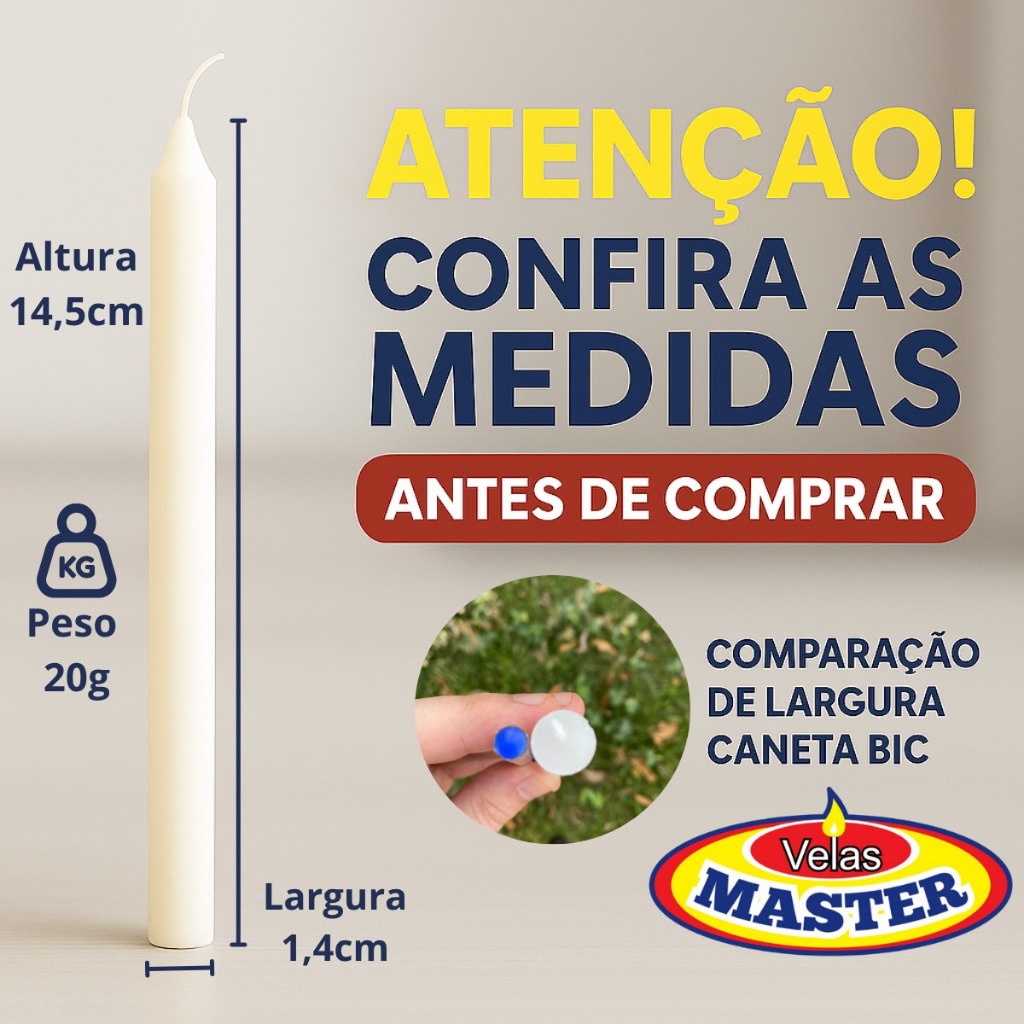 Contém 50 ou 100 unidades de vela palito branca tradicional número 5, a depender da quantidade selecionada, produzida com parafina pura, enviada a granel em caixa de papelão. Características da vela: • Peso: Aproximadamente 19g; • Altura da vela: 14,5cm; • Diâmetro da vela: 1,4cm. Benefícios do produto: ✔️ Produto a pronta entrega; ✔️ Bem embalado; ✔️ Ótima queima; ✔️ 100% Parafina; ✔️ Não exala odor ou fumaça na queima. Por que comprar produtos Velas Master? ✔️ Qualidade (Utilizamos a melhor parafina do mercado); ✔️ Tradição (Empresa há mais de 20 anos no topo do segmento); ✔️ + de 1 MILHÃO de velas produzidas mensalmente; ✔️ Nunca atrasamos os envios; ✔️ Equipe dedicada no suporte ao cliente; ✔️ Garantia de fábrica 30 dias; ✔️ Emitimos NFe.