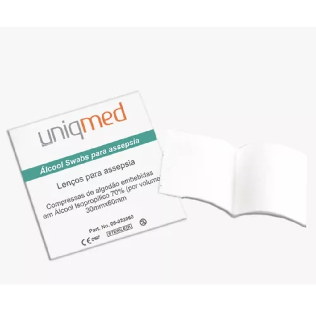 ALCOOL SWAB*LENCOS UMEDECIDOS EM ALCOOL 70% UNIQMED - **5 cxs - 500 Unidades** Mantenha-se protegido e seguro com nossos lenços de Assepsia, especialmente formulados com Álcool 70% para garantir uma higienização eficaz e prática. CARACTERISTICAS DO PRODUTO: *Álcool 70%:Nossa fórmula contém a quantidade ideal de álcool para eliminar germes, bactérias e vírus. *Maciez e Resistência: Os lenços são suaves para a pela, mas ao mesmo tempo resistentes para uma limpeza completa. *Individuais e portáteis: Cada lenço é embalado individualmente, tornando-os perfeitos para levar consigo onde quer que vá. USE EM DIVERSAS OCASIÕES: • No dia a dia: Ideal para higienizar as mãos e superfícies, proporcionando uma sensação refrescante; • Viagens: Perfeito para limpar objetos em aviões, hotéis e outros ambientes. • No trabalho: Mantenha o seu local de trabalho limpo e seguro. Indicado para realização de exames e procedimentos. Segurança em primeiro lugar: Nossos Lenços de Assepsia passam por rigorosos controles de qualidade e são fabricados seguindo as melhores práticas da indústria proporcionando a você a tranquilidade que merece. Fácil de usar: 1) Abra a embalagem individual; 2) Retire o lenço; 3) Passe suavemente sobre a área a ser higienizada; 4) Descarte o lenço usado de forma adequada Outras características: Pacote econômico Embalagem compacta