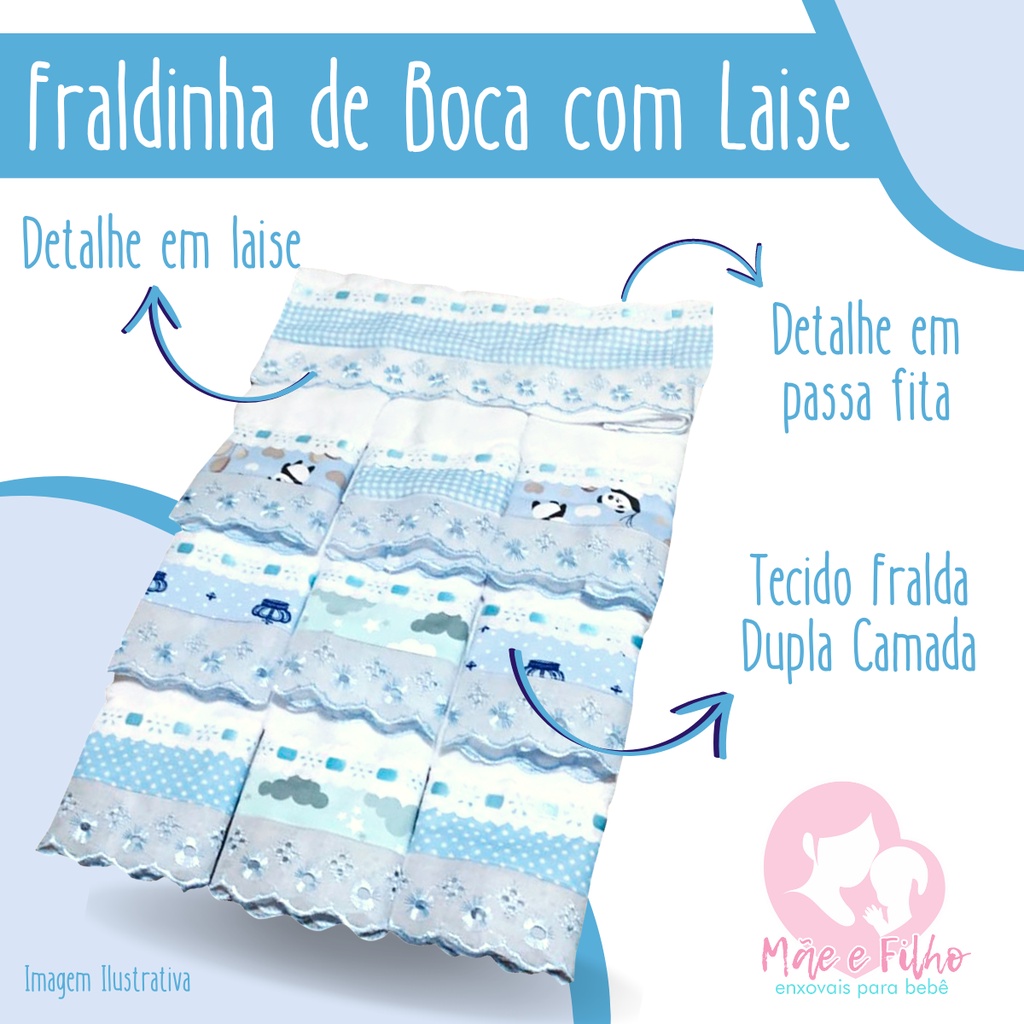 Kit 5 Fraldinha de Boca Bebê Bordada com Renda Passa Fita Tecido Duplo 100% Algodão Macio **ENVIO IMEDIATO** Garanta o máximo de conforto e cuidado para o seu bebê com nosso kit de fraldinhas de boca. Feitas com carinho para a pele sensível dos pequenos, são peças essenciais para o enxoval. VOCE RECEBERÁ: - 5 Unidades de Fraldinha de Boca com detalhes bordados e acabamento delicado. ESPECIFICAÇÕES: - Tecido confeccionado em 100% algodão, garantindo um toque macio e seguro para a pele do bebê. - Acabamento refinado com renda bordada, passa fita e fita de cetim para um visual encantador. MEDIDAS: - Cada fraldinha possui o tamanho ideal de 35 cm x 35 cm. PERFEITO PARA: - Manter o bebê sempre limpinho durante a amamentação ou na introdução alimentar. - Compor o enxoval com peças de alta qualidade, úteis e charmosas. - Presentear em chás de bebê com um item indispensável e de muito bom gosto. DIFERENCIAIS: - Produto hipoalergênico, desenvolvido para não causar irritações na pele sensível do recém-nascido. - Kit com 5 unidades que oferece excelente custo-benefício e praticidade para o dia a dia. MeF – Mãe e Filho Enxovais. Há 20 anos, de mãe e filho para mãe e filho.