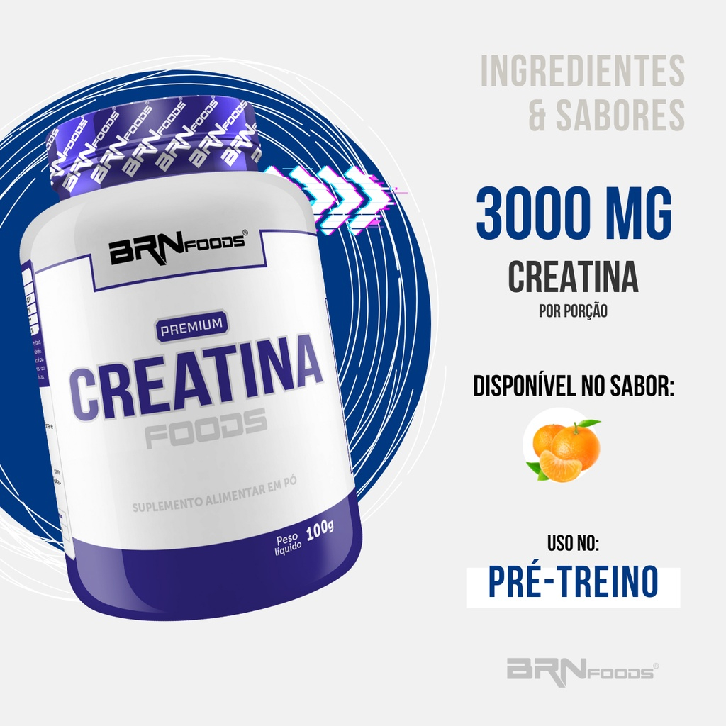 Premium Creatina Foods – BRN Foods A Premium Creatina Foods é um suplemento alimentar em pó formulado à base de creatina monoidratada, combinada com carboidratos, desenvolvida para consumo diário conforme orientação nutricional. O produto está disponível no sabor tangerina e pode ser utilizado isoladamente ou associado a outras rotinas alimentares. Ingredientes: Creatina monoidratada em pó, amilopectina, maltodextrina, corante amarelo crepúsculo e aroma. Informação Nutricional Porção de 10 g (1 colher de sopa), conforme tabela nutricional do produto. Sugestão de Uso Adicionar 10 g de Premium Creatina Foods em 100 ml de água. Utilize uma coqueteleira para facilitar a mistura. Consumir imediatamente após o preparo. Avisos Este produto não substitui uma alimentação equilibrada. Consulte um profissional de saúde ou nutricionista antes de iniciar o consumo. Manter fora do alcance de crianças. Conservar em local seco, fresco e ao abrigo da luz. Produto indicado para adultos. Produtos direto da fábrica.
