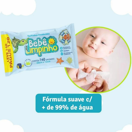 Lenço Toalha Umedecida Bebê Limpinho 140 Unidades As Toalhas Umedecidas Bebê Limpinho são perfeitas para a higiene delicada do seu bebê. Desenvolvidas para a pele sensível dos pequenos, essas toalhas oferecem uma limpeza suave e refrescante a qualquer hora do dia.Características:Fórmula suave e sem álcool.Enriquecidas com ingredientes calmantes e hidratantes.Ideal para uso diário no rosto, mãos e corpo do bebê, além da troca de fraldas.Benefícios:Limpeza suave e refrescante.Não causa irritações, mantendo a pele limpa e protegida.Perfeitas para usar em casa, passeios e viagens.Escolha as Toalhas Umedecidas Bebê Limpinho para uma solução prática, segura e eficaz. Garanta o conforto e bem-estar do seu bebê com um produto confiável que cuida da pele com carinho.
