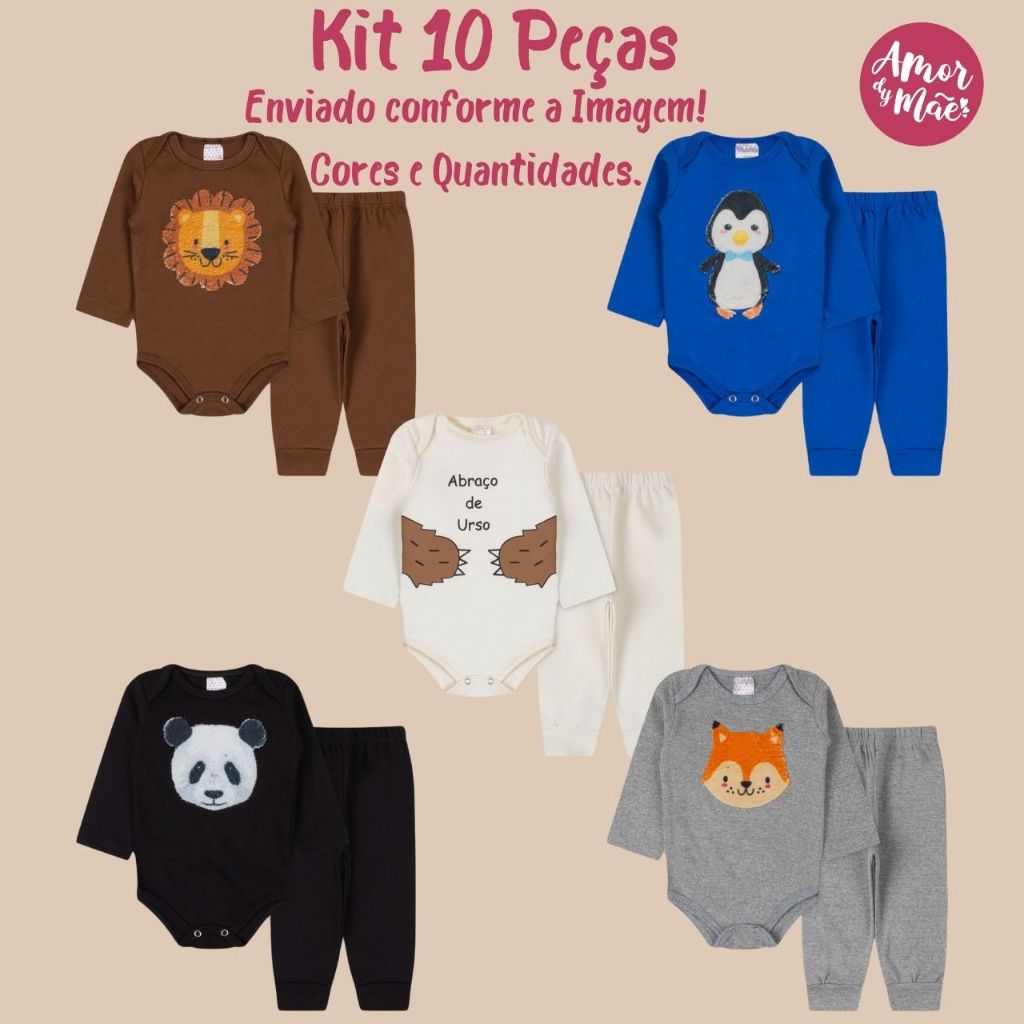 kit 6,8,10 peças calça mijão e body manga longa infantil bebe masculino, Roupa para Bebe Algodão