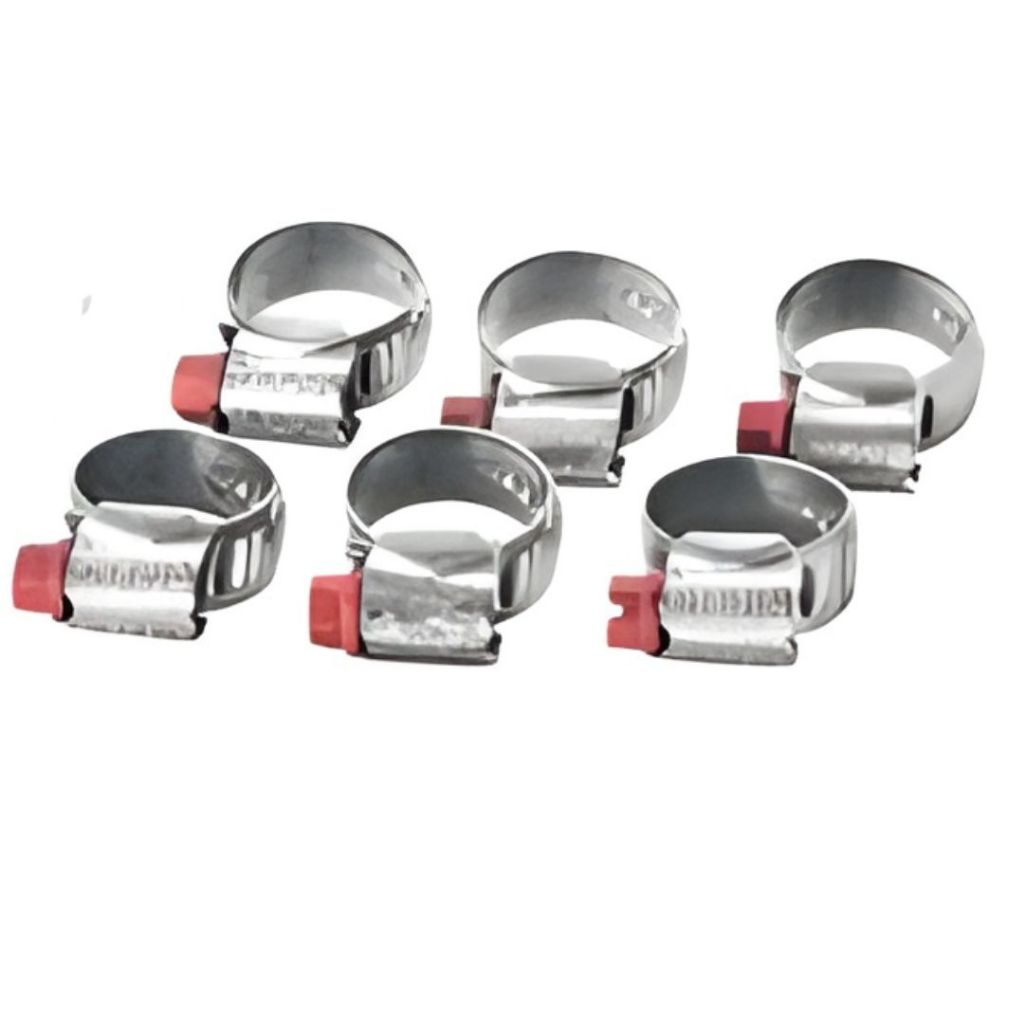 Kit com 6 abraçadeiras de alta resistência, disponíveis em diferentes tamanhos para melhor ajuste e fixação em mangueiras, tubos e conexões automotivas, garantindo segurança e durabilidade. Ø mm Mín. Máx. 9x13 9 13 Ø pol Mín. Máx. 5/16 1/2