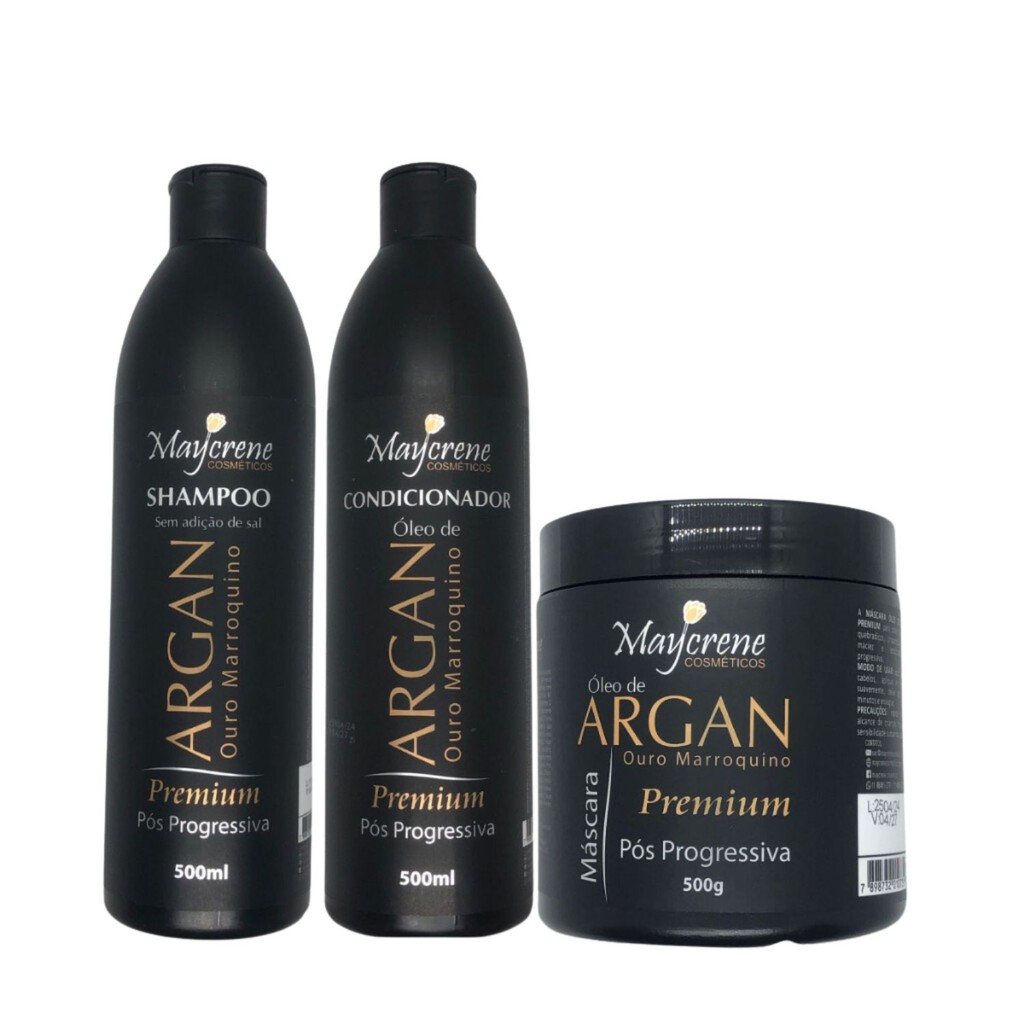 Produto a pronta entrega, enviamos em até 24 horas úteis Contem 6 itens Kit Completo Argan Premium Shampoo - 500ml Condicionador - 500ml Máscara - 500ml Kit Argan Premium pós progressiva ouro marroquino, é ideal para quem fez progressiva ou outros tratamentos alisante, ela contém agentes que reconstroem e revitalizam os cabelos, mantendo o liso por muito mais tempo. Conheça toda a linha Pós Progressiva Óleo de Argan Ouro Marroquino! Shampoo Pós Progressiva Óleo de Argan O shampoo Argan foi desenvolvido para limpar e tratar os cabelos. Enriquecido com óleo de argan garante a eficiência no tratamento capilar, excelente para promover hidratação e restauração dos fios, sendo ideal para cabelos que passam por processos químicos, inclusive tratamento pós-progressiva, mantendo o liso por muito mais tempo. Condicionador Pós Progressiva Óleo de Argan O Condicionador Argan Naturim condiciona e trata os cabelos que passaram por processos químicos: progressiva, relaxamento, decapagem e colocação em eficiência. Enriquecido com óleo de argan, garante um perfeito condicionamento, hidratação e restauração dos fios conferindo brilho, maciez e leveza mantendo o liso por muito mais tempo. Máscara Pós Progressiva Óleo de Argan A Fórmula da Máscara Argan Premium foi desenvolvida com vitaminas e extrato que promovem tratamento nutritivo com hidratação profunda, junto aos poderosos óleos vegetais que formam uma blindagem dos fios, proporciona cabelos macios, lisos, hidratados, com brilho intenso, sem fios rebeldes e o indesejável frizz. Benefícios do Kit Argan Reconstrução rápida e profunda dos fios Revitalização dos cabelos Mantém o liso por mais tempo Hidratação profunda Alta nutrição Ideal para cabelos com progressiva