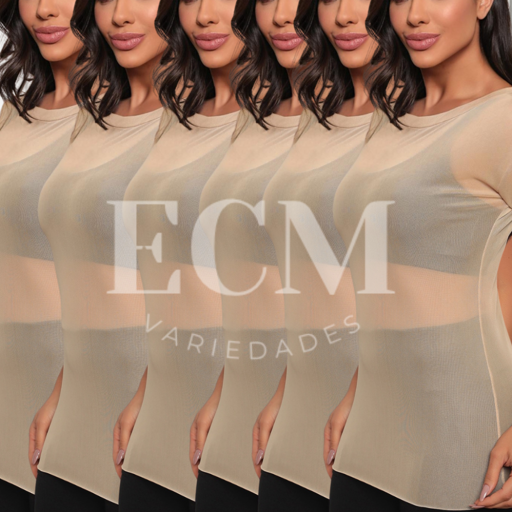 ENVIO IMEDIATO! FABRICAÇÃO PRÓPRIA! Blusa de tule transparente, perfeita para deixar o look fresco e confortável. Muito utilizada para prática esportiva, já que é confortável e leve. ATENÇÃO: ESTE ANÚNCIO VENDE O KIT COM 6 BLUSAS. Tecido: tule Composição: 90% poliéster / 10% elastano Manga Curta Fotos e vídeo reais do produto. Cores disponíveis: preto, branco, pink, nude/bege, azul marinho e vermelho. Tamanhos: P M G GG G1 G2 G3 - Tamanho P (34-36), peso ideal até 55 kg Comprimento: 69 cm | Busto: 81 cm | Largura: 71 cm - Tamanho M (38-40), peso ideal até 65 kg Comprimento: 70 cm | Busto: 82 cm | Largura: 72 cm - Tamanho G (42-44), peso ideal até 75 kg Comprimento: 77 cm | Busto: 99 cm | Largura: 89 cm - Tamanho GG (46-48), peso ideal até 85 kg Comprimento: 78 cm | Busto: 100 cm | Largura: 90 cm - Tamanho G1 (50), peso ideal até 95 kg Comprimento: 83 cm | Busto: 125 cm | Largura: 109 cm - Tamanho G2 (46-48), peso ideal até 105 kg Comprimento: 84 cm | Busto: 126 cm | Largura: 110 cm - Tamanho G3 (46-48), peso ideal até 110 kg Comprimento: 85 cm | Busto: 127 cm | Largura: 111 cm Tabela de tamanhos consta no carrossel de fotos. O top da foto e vídeo não acompanha a blusa. Promoção por tempo limitado. Garanta já a sua e visite nossa loja para conferir mais looks perfeitos.