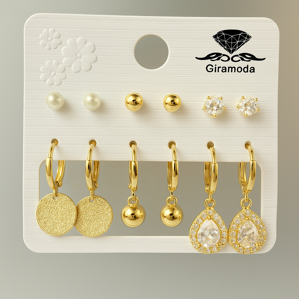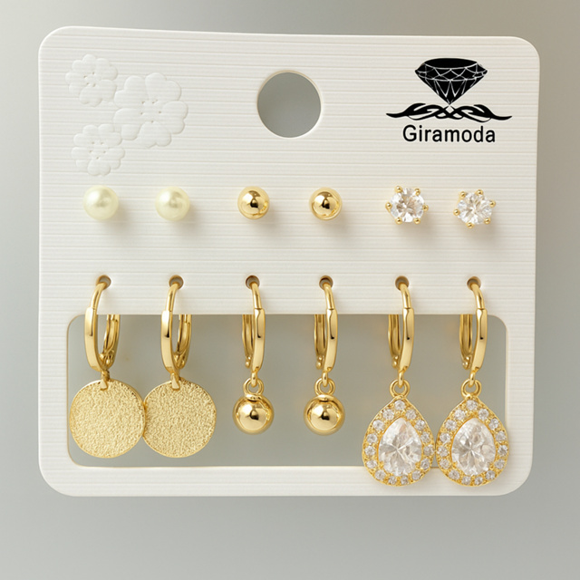 Kit 6 brincos cravejado pedra de zirconia argolinha pingente gota/bolinha/redondo / folheados a ouro18k prata 925