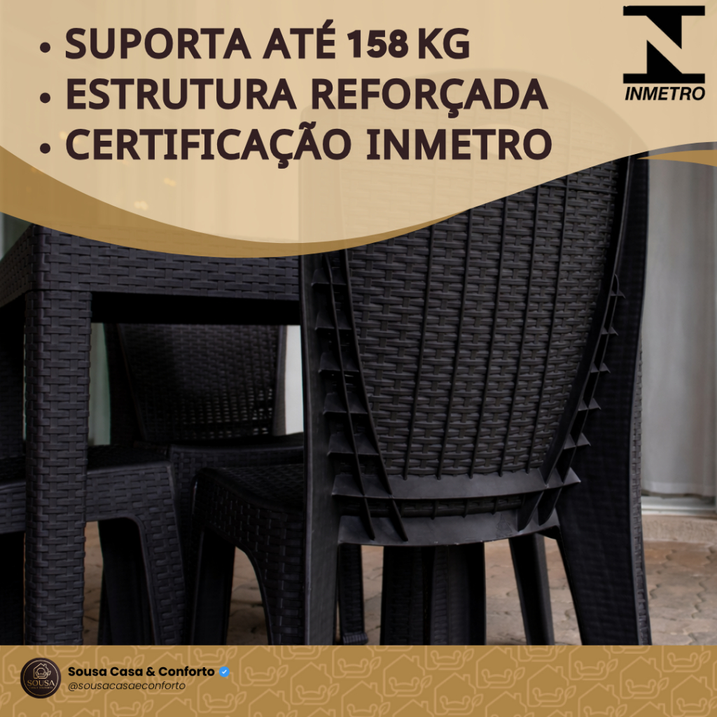 ✨ Kit com 06 Cadeiras Rattan – Conforto, Praticidade e Estilo para qualquer ambiente! ✨ ✔️ Durabilidade e segurança: cada cadeira suporta até 158 kg, garantindo resistência e uso diário sem preocupações. 🪑 Design moderno e elegante: acabamento em textura rattan que imita o trançado natural, proporcionando sofisticação e combinando com diferentes estilos de decoração – seja na sua casa, área gourmet ou até em ambientes comerciais. 📦 Praticidade total: 📚 Empilháveis – fáceis de guardar, otimizando espaço. 🧼 Fáceis de limpar – basta um pano úmido para manter sempre impecáveis. 🚚 Portáteis e leves – mova para qualquer ambiente com facilidade. 🌿 Versatilidade garantida: Ambientes internos: sala de jantar, cozinha, salão de festas, área gourmet. Ambientes externos: área da piscina, varanda, jardim, garagem, quintal. 📋 Especificações Técnicas: Material: Polipropileno injetado de alta resistência Estrutura: Anatômica Cores disponíveis: 🟤 Marrom Escuro | 🤎 Camurça | ⚫ Preto Capacidade máxima: 158 kg por cadeira Kit: 06 unidades 🌟 Benefícios principais: resistentes, empilháveis, fáceis de transportar, práticas, leves e com design que valoriza a decoração de qualquer espaço.