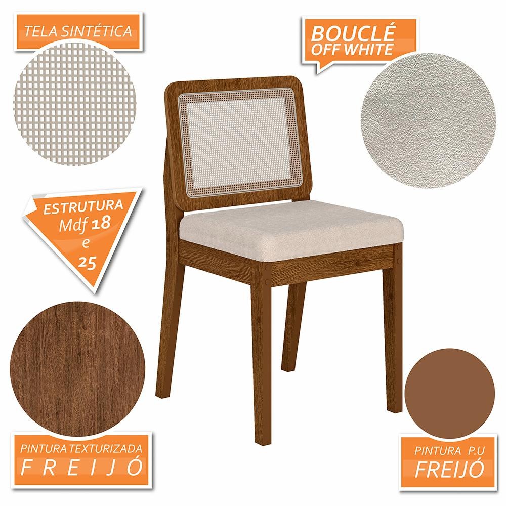 Conjunto 6 Cadeiras Sextavada Sydney com um design distintivo e moderno adiciona um toque contemporâneo, mas também proporciona conforto. Invista agora para adicionar essas peças únicas ao seu ambiente, elevando o visual com design e conforto! Detalhes Técnicos das Cadeiras - Assento Tapeçado, Estofado e Fixo - Encosto com Tela Sextavada - Palha Sintética - Tecido Bouclé - Estrutura: MDF - Tonalidade: Freijó/Bouclé off white - Medida: A: 84CM x L: 53CM x P: 45CM - Do chão até o assento possui 47cm - Suporta até 90kg (cada) Conteúdo da Embalagem - 06 Cadeiras - Manual de Montagem - Acessórios para Montagem Observações Importantes - Imagens ambientadas meramente ilustrativas, objetos decorativos não compõe o produto; - Produto novo, garantia somente para defeitos de fabricação: 3 meses; - Não realizamos entregas em zonas rurais, via caminhos fluviais e distritos, NÃO ACEITAMOS CEP GERAL; - Não trabalhamos com entrega agendada. O recebedor deve ter mais de 18 anos. O valor do frete não inclui: subida de escada, elevador ou lançamento de produto, em condomínio residencial a entrega é feita somente até a portaria. As entregas são realizadas em dias e horários comerciais; - Ao receber o produto observe se a embalagem está em perfeita condição. Confira atentamente a quantidade de volumes; - Produto entregue desmontado. É responsabilidade do cliente a montagem/instalação do produto, inclusive despesa para sua realização. Recomendamos a contratação de um profissional especializado; - Evitar a exposição direta à luz solar e à umidade. Limpar com pano macio e seco, não utilizar produtos químicos; - A cor do produto pode variar de acordo com o monitor, a iluminação do ambiente ou sua percepção visual.
