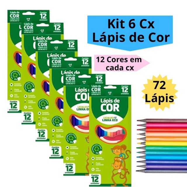 Kit 6 Caixas de Lápis de Cor Caixa com 12 Cores Escolar Sextavado Leo&Leo