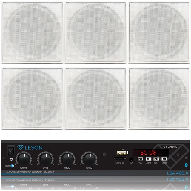 Mais de 15 anos de experiência no mercado com os melhores produtos e o melhor atendimento! Kit Amplificador Som Ambiente 4 Canais Bt Usb Controle de Grave Médio e Agudo 60W Leson + 6 Caixas de Embutir Arandelas Quadradas com Falante de 6 Pol 55W 8 Ohms Compatível com ALEXA e GOOGLE ASSISTENTE Amplificador Receiver Som Ambiente LSA 400.4 60W 15WRMS por canal Digital - Le Son Transforme seu ambiente com o Amplificador Receiver Som Ambiente LSA 400.4 da Le Son, um equipamento de alta qualidade que garante uma experiência sonora imersiva. Com tecnologia de Classe D, este receiver de 60W é perfeito para quem busca potência e clareza de som. Especificações do Produto: - Modelo: LSA 400.4 - Potência Total: 60W (15W RMS por canal) - Número de Canais: 4 - Impedância Mínima por Canal: 4 Ohms - Conexões: - USB - Micro SD Card - Bluetooth - Rádio FM - Entrada Auxiliar P2 e RCA - Controle de Graves, Médios e Agudos - Bivolt Automático: 110V - 220V - Fonte Interna: Sim - Controle Remoto: Incluído Dimensões do Amplificador: - Largura: 24,5 cm - Comprimento: 15,5 cm - Altura: 5 cm - Peso: 1,00 kg Caixa de Som Arandela de Embutir Teto 6 polegadas Quadrada Branca 55W 8 Ohms As Arandelas para som ambiente de 6 polegadas Orion é discreta e elegante, proporciona um acabamento moderno e elegante, além de integrar perfeitamente a arandela ao ambiente. O alto-falante de 6 Polegadas 55W 8 Ohms proporciona um som ambiente agradável, possui um sistema de suportes para facilitar a instalação. Ideal para instalar no teto de Gesso, Pvc, Sanca, Madeira, Salas, Escritórios, Quartos, Recepção, etc. Ligação por fio paralelo 2x0,50mm acima (não incluso) Especificações: Faixa de Frequência: 48 HZ a 10.000Hz Impedância Nominal: 8 ohms Potência musical: 55 Wrms Sensibilidade: 84dB Carcaça em ABS Bobina Simples Largura: 21 cm Comprimento: 21 cm Dimensões internas: 18,2 cm Altura:6,5 cm Conteúdo da Embalagem: 1 - Receiver LSA400.4 1 - Controle 6 - Caixas de som de embutir + suportes de fixação