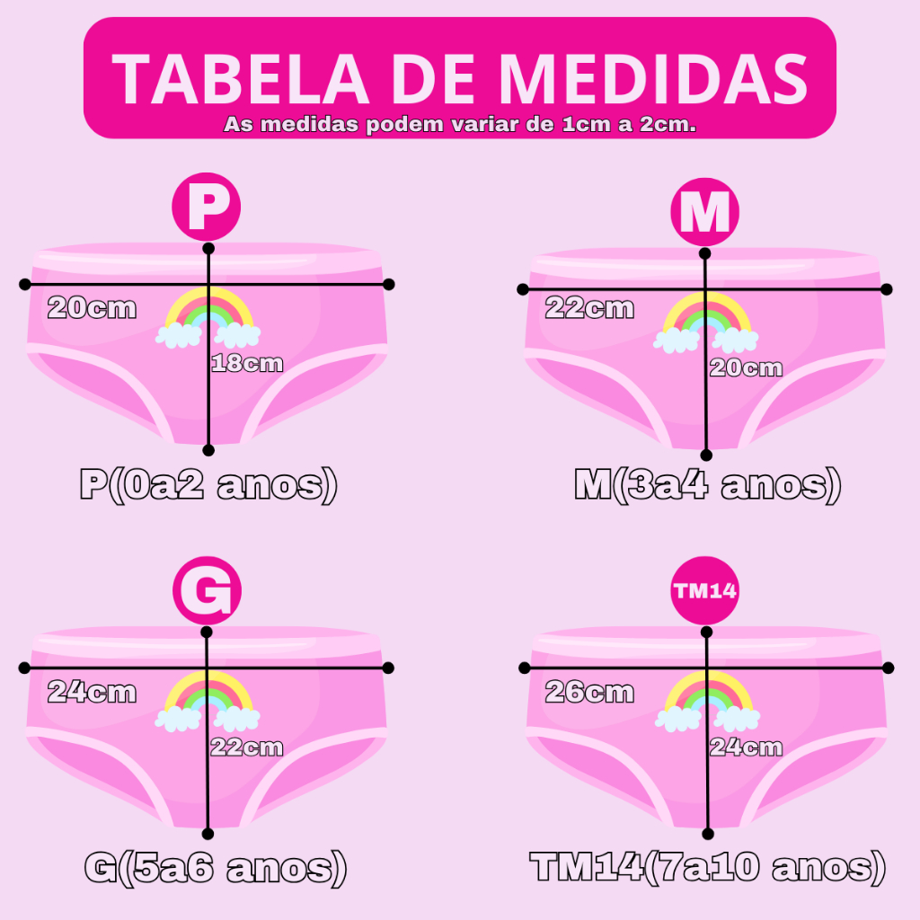 Kit composto por 6 calcinhas com estampas e cores sortidas da marca Kellynha. Calcinhas feitas em algodão, são de excelente qualidade com ótimo acabamento. Kit de calcinhas infantis, perfeito para o conforto da sua pequena! Feitas em algodão macio, essas três calcinhas trazem estampas delicadas que combinam fofura e estilo. O detalhe especial na cintura com babadinhos e a aplicação de uma pequena flor no centro garantem um toque encantador. Ideais para o dia a dia, oferecendo o máximo de conforto e suavidade para a pele sensível das meninas. Qualidade da matéria prima; Confeccionada em Algodão; Elástico da calcinha confortável para não criar atrito na pele; Possui aplique de flor; Detalhe especial na cintura com babadinho; Acabamento em costura no tom da peça; Proporciona um conforto excepcional. Composição: 100% Algodão Tabela de Medidas: Tamanho P(1a2 anos): Cintura 20cm x Cintura esticada 28cm x Altura 18cm x Perna 14cm x Quadril 21cm Tamanho M(3a4 anos): Cintura 22cm x Cintura esticada 30cm x Altura 20cm x Perna 16cm x Quadril 23cm Tamanho G(5a6 anos): Cintura 24cm x Cintura esticada 34cm x Altura 22cm x Perna 17cm x Quadril 25cm Tamanho TM14(7a10 anos): Cintura 26cm x Cintura esticada 36cm x Altura 24cm x Perna 18cm x Quadril 26cm ---------------------------------------------- OBS: As medidas são aproximadas. Podendo haver variações de até 2cm para mais ou para menos. ---------------------------------------------- ** GIGA MODAS: Dicas de Compra! 1. Leia todo o anúncio antes de comprar. 2. Verifique se seus dados de contato estão atualizados no momento da compra. 3. Confira o endereço de recebimento , pois não temos como alterá-lo. 4. Com o carrinho de compras, você pode escolher quantos produtos quiser da nossa loja e pagar um único frete. Qualquer dúvida entre em contato pelo campo de perguntas ou chat. GIGA SA agradece a preferência.