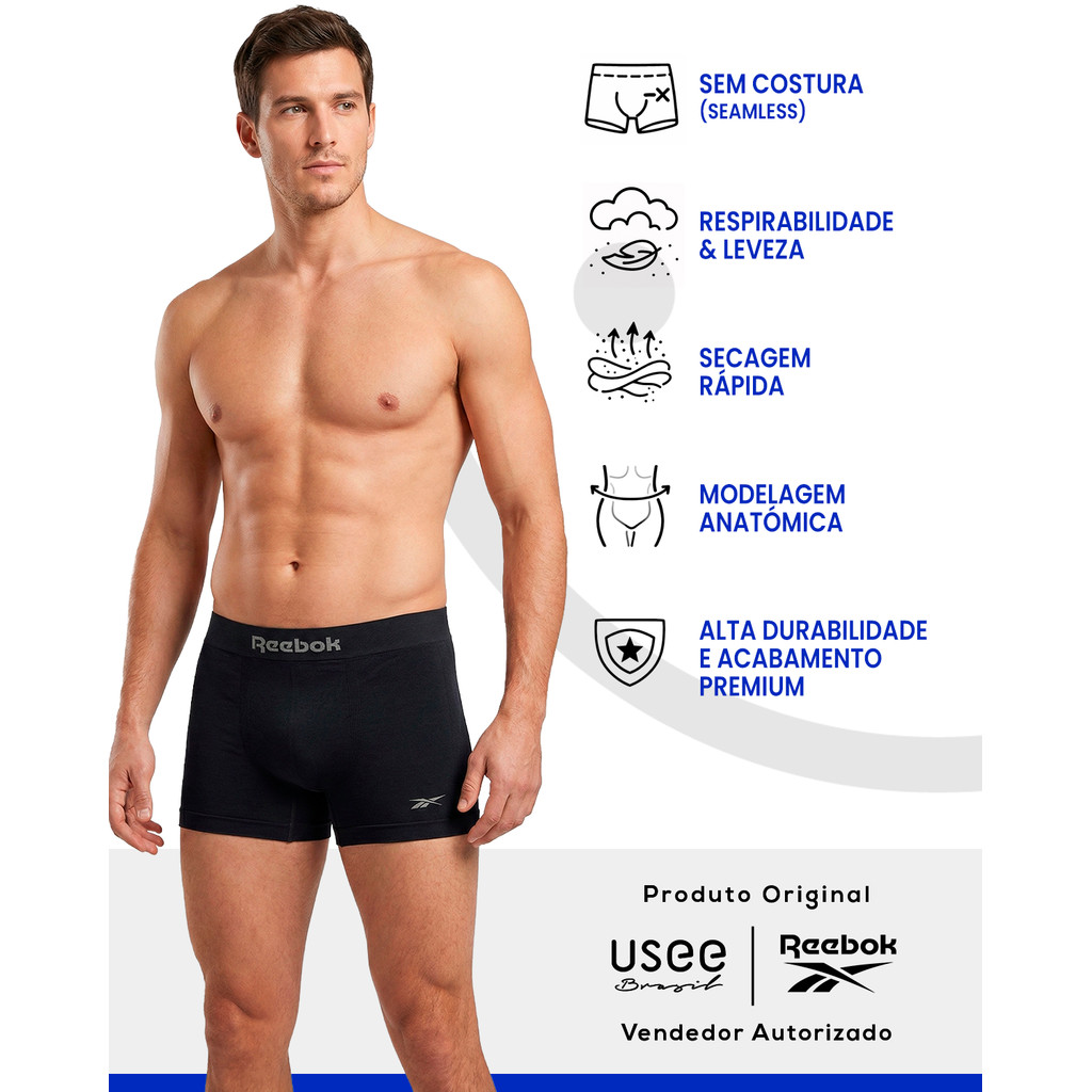 Kit 6 Cueca Boxer Masculina Reebok Classic Sem Costura em Poliamida Original