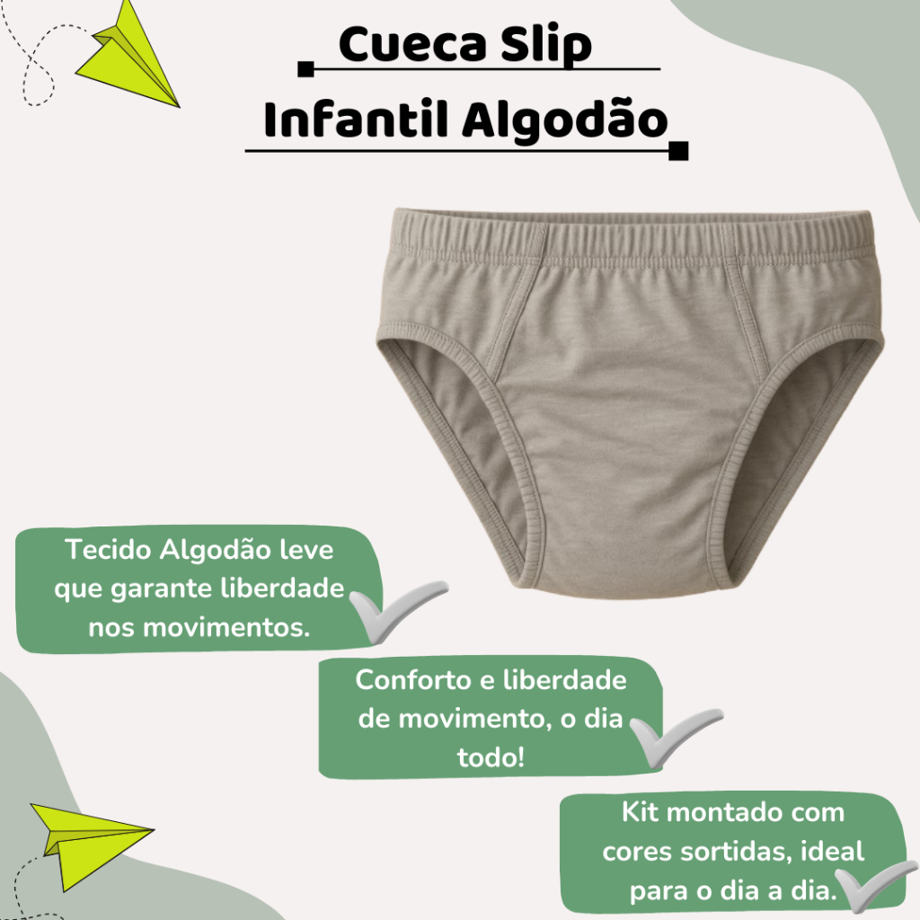 | Kit 6 Cueca Slip Infantil 100% Algodão Menino Criança Colorido este produto | R$ 23,99 | 29% | 4.6/5 | 16 |