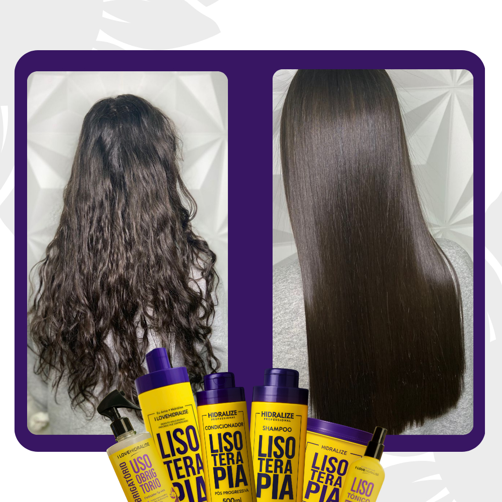 Kit 6 em 1 Lisoterapia Profissional – Tratamento Capilar Completo Transforme seus fios com o Super Kit Capilar Completo da Linha Lisoterapia, a queridinha do Brasil para quem busca resultado de salão em casa. O kit contém Progressiva Orgânica Sem Formol (1L), Protetor Térmico Defrizante (500ml), Tônico Capilar Lisotônico (100ml), Shampoo Pós-Progressiva (500ml), Condicionador Pós-Progressiva (500ml) e Máscara de Hidratação Extrema (400g). Este é um tratamento capilar profissional desenvolvido para hidratar profundamente, alinhar os fios, controlar o frizz e restaurar a fibra capilar com brilho intenso e duradouro. A fórmula inovadora da Lisoterapia Hidralize Cosmetic oferece alisamento orgânico sem formol, garantindo hidratação profunda, nutrição intensa, reconstrução capilar e brilho espelhado. Indicada para todos os tipos de cabelo, inclusive cabelos com química, coloração, progressiva ou danificados, a Linha Lisoterapia promove cabelos lisos, disciplinados, sedosos e saudáveis desde a primeira aplicação. Benefícios do Kit Lisoterapia 6 em 1: Progressiva Orgânica Sem Formol: proporciona alisamento natural, brilho intenso e fios totalmente alinhados Shampoo e Condicionador Pós-Progressiva: garantem hidratação prolongada, maciez, força e manutenção do liso extremo Máscara de Hidratação Extrema: repara fios danificados e oferece nutrição e reconstrução capilar profunda Protetor Térmico Defrizante: protege contra o calor do secador e chapinha, proporcionando efeito antifrizz e brilho duradouro Tônico Capilar Lisotônico: fortalece a raiz, estimula o crescimento dos fios e combate a queda capilar A linha Lisoterapia é formulada com colágeno, aminoácidos essenciais e ativos vegetais, oferecendo um tratamento capilar completo e profissional, com resultados até 7x mais potentes que escovas comuns, sem uso de formol. Chega de fios danificados, volumosos ou sem brilho. Tenha cabelos lisos, hidratados, reconstruídos e com aparência de salão todos os dias. Modo de Uso: Lave com o Shampoo Pós-Progressiva Lisoterapia. Aplique a Progressiva Orgânica Sem Formol Lisoterapia nos cabelos úmidos, deixe agir por 40 minutos e enxágue 80%. Escove e pranche em mechas finas para um alisamento duradouro. Finalize com o Protetor Térmico Defrizante Lisoterapia para proteger e selar os fios. Faça a manutenção com o Condicionador e a Máscara de Hidratação Extrema para hidratação e brilho contínuo. Utilize o Tônico Capilar Lisotônico diariamente no couro cabeludo para crescimento e fortalecimento capilar.