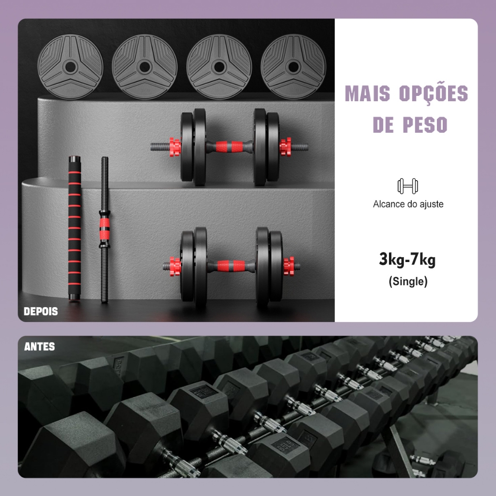 Com o Conjunto de halteres multifuncional 6 em 1Com ele, você pode obter um par de halteres, também barras, kettlebells e suportes de flexão, que ajudam você a fazer muitos exercícios, incluindo supino, agachamento sumô, etc. -Materiais duráveis: O exterior das peças dos halteres é feito de materiais PE de alta qualidade, o que evita efetivamente o desgaste do piso. -Barra de halteres antiderrapante: A superfície da barra de halteres é feita de material ABS e fixada em uma textura antiderrapante, que fortalece o atrito da mão e ajuda a controlar melhor o halter durante o exercício. -Porcas de segurança: Os conjuntos contêm porcas de segurança. O espessamento da rosca da porca mantém efetivamente a peça no lugar, para evitar tremores de movimento e a queda do peso. Garantia de segurança. -O pacote contém: 4 anilhas de 2kg cada; 4 anilhas de 1,5kg cada; 2 Barras Rosqueáveis; 1 Barra Rosqueável com Proteção de EVA; 1 Base para Kettlebell; 2 Puxadores para Kettlebell (com função dupla de apoios para flexão) 5 Roscas para as Barras Rosqueáveis; Multifuncional e prático, permite que a placa seja removível, podendo assim tornar o peso ajustável sua necessidade. A melhor opção para quem busca treinos perfeitos e ajudam a melhorar a saúde cardiovascular, queimar calorias, perder peso, ganhar músculos ou aumentar a resistência muscular. - Tenha seu equipamento profissional em casa; - Super versátil, ajustável para que você consiga treinar vários tipos de movimentos; - Com este equipamento você poderá treinar vários grupos musculares. Braços, pernas, costas, bíceps, tríceps, ombro e muito mais; - Super Fácil de Utilizar; - Você consegue ajustar o peso nas barras, de acordo com a sua necessidade; - As barras rosqueáveis são super fáceis de montar e desmontar; - Cuide do seu corpo e da sua saúde com um equipamento de qualidade superior; - A sua melhor opção para levar os seus treinos para um outro nível, queimar calorias, ganhar e fortalecer seus músculos;