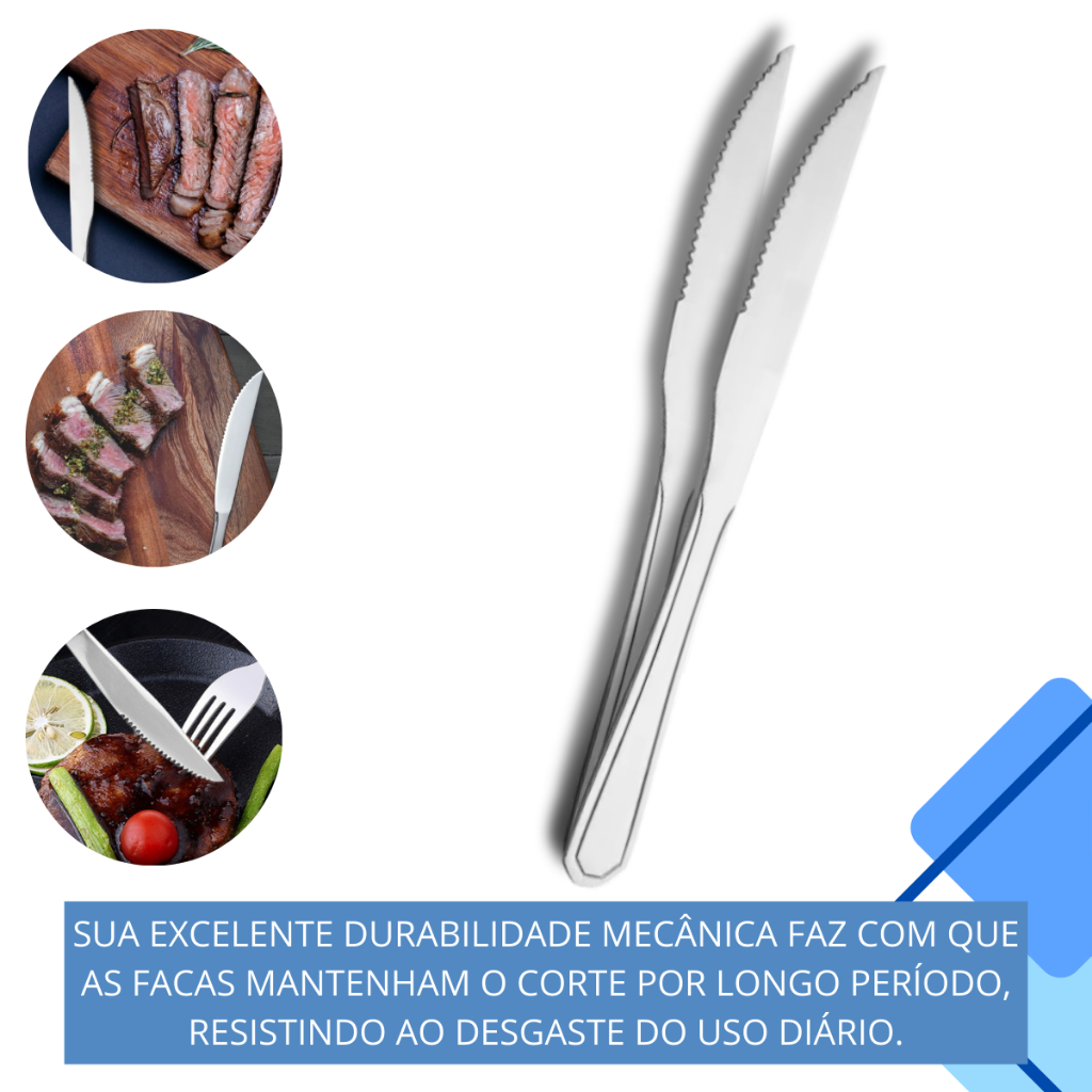 Jogo de Facas de Mesa com Serra Aço Inox - Kits com 6, 12, 24, 36 e 120 Unidades Qualidade profissional e durabilidade incomparável para sua mesa! Eleve a experiência de suas refeições, seja em casa ou em seu estabelecimento, com o nosso Conjunto de Facas de Serra em Aço Inox. Projetadas para oferecer um corte preciso e suave, estas facas são a combinação perfeita de funcionalidade, resistência e design clássico, indispensáveis para o dia a dia e para momentos especiais. Fabricadas inteiramente em aço inoxidável de alta qualidade, elas garantem máxima higiene, pois não soltam resíduos nos alimentos, e uma resistência superior contra ferrugem e corrosão, mantendo o brilho e a aparência de novas por muito mais tempo. A lâmina serrilhada é afiada com precisão, ideal para cortar carnes assadas, pães crocantes, pizzas, legumes e frutas sem esforço e sem amassar o alimento. É a ferramenta perfeita para o churrasco de fim de semana, o almoço em família ou para o uso intenso em restaurantes, churrascarias e buffets. Principais Benefícios: 100% Aço Inox: Material nobre que assegura durabilidade, beleza e facilidade de limpeza. Corte de Precisão: A lâmina de serra desliza facilmente, garantindo um corte limpo e eficaz. Versatilidade de Uso: Perfeitas para uso doméstico, restaurantes, eventos, hotéis e muito mais. Custo-Benefício: Adquira kits em volume e garanta a padronização e qualidade que seu serviço merece. Escolha o kit ideal para sua necessidade: 6 Unidades: Para o dia a dia de casais e famílias pequenas. 12 Unidades: Ideal para famílias maiores ou para ter sempre à mão. 24 Unidades: Perfeito para pequenas celebrações ou para estabelecimentos comerciais. 36 Unidades: Ótima opção para restaurantes e buffets com grande movimento. 120 Unidades: A solução definitiva para grandes operações, garantindo o melhor preço por unidade. Invista em um produto que une tradição e qualidade. Adquira já seu conjunto de facas e sinta a diferença em cada corte!