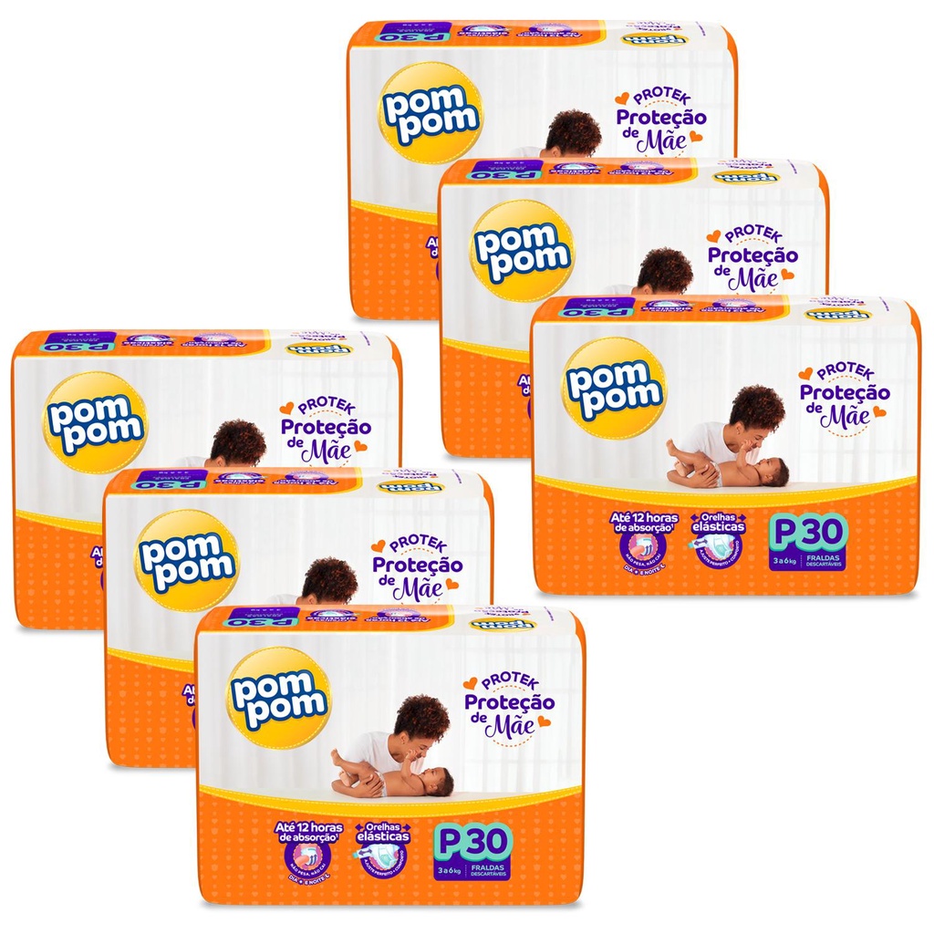 Kit Contém: 6 Pacotes de Fraldas Pom Pom Protek Proteção de Mãe Jumbo P com 30un cada Pom Pom Protek Proteção de Mãe é a proteção que cuida do seu bebê por até 12 horas, garantindo dias e noites tranquilas, com orelhas elásticas que garantem mais conforto e um ajuste perfeito na cinturinha do bebê, e canal superabsorvente que distribui o xixi mais rápido, evitando que a fralda pese e caia entre as perninhas do bebê.