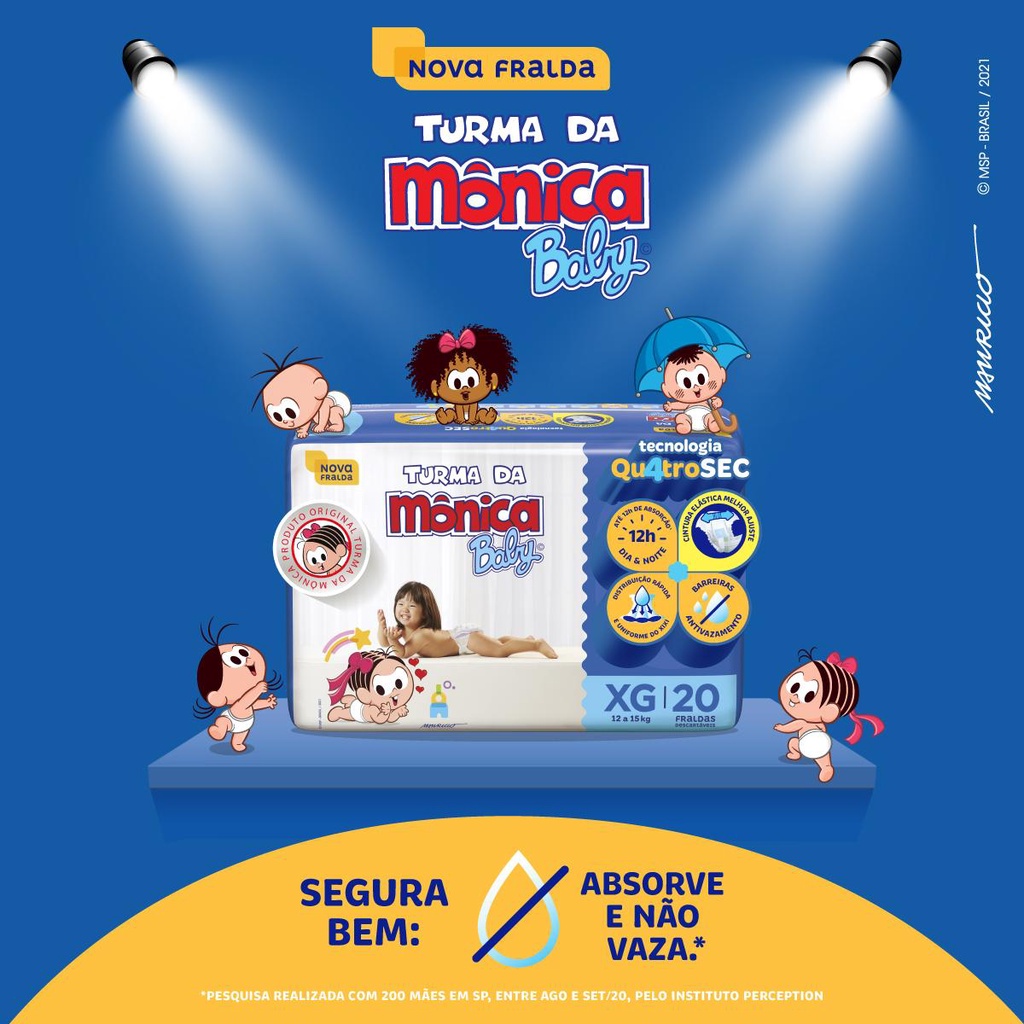 Kit Contém: 6 Pacotes de Fraldas Turma da Mônica Baby Jumbo XG com 20un cada A Turma da Mônica Baby uniu proteção e conforto em uma nova opção de fralda, para garantir que seu bebê cresça feliz e tenha as melhores lembranças da sua infância. A Nova fralda Turma da Mônica Baby possui a nova Tecnologia QuatroSec para que ele fique calmo, tranquilo e seguro durante o dia e a noite toda. Conta com um exclusivo sistema de canais que distribui mais rápido o xixi, barreiras anti-vazamento e uma fina camada extra que ajuda a manter o bebê sequinho por até 12 horas, além de cintura elástica que proporciona um perfeito ajuste no corpinho.