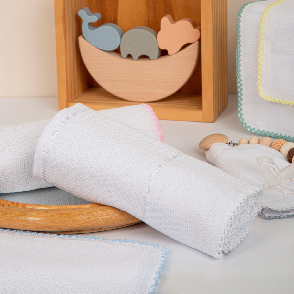 Kit 6 Fraldinhas de Boca Mabber com Crochê Barra para Bordado Ponto Cruz - Cores Sortidas - Enxoval de Bebê