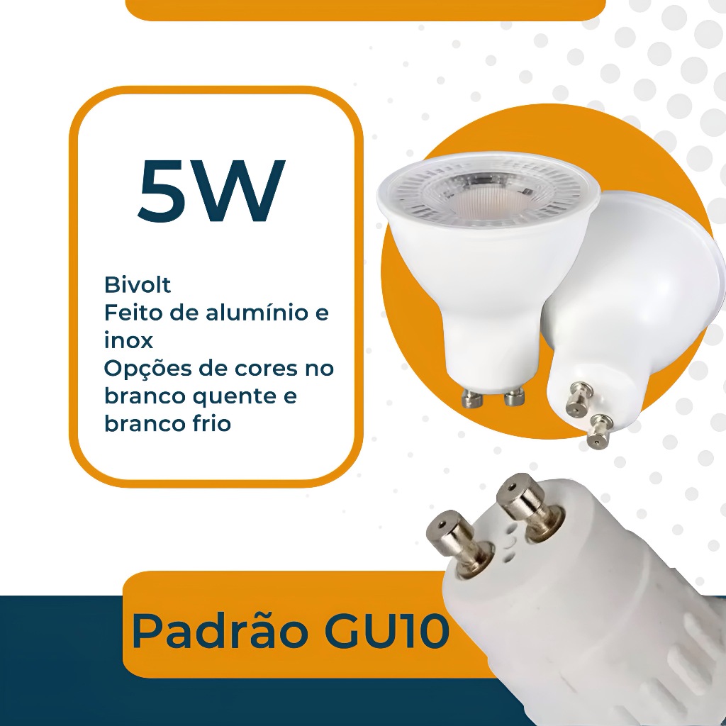 MONTAMOS KITS DE ACORDO COM SUA NECESSIDADE! CONSULTE-NOS. Especificações: Tipo de Base: GU10 Tensão de entrada: 110 - 220V (Bivolt) Material: Alumínio de aço inox de alta resistência Cor da luz: Branco Frio (6000 - 6500K) ou Branco Quente (3000 - 3500K)- SELECIONAR NO ATO DA COMPRA Diâmetro: 4,8cm X 7Cm Luminosidade: 350Lm 4,5W - 5W